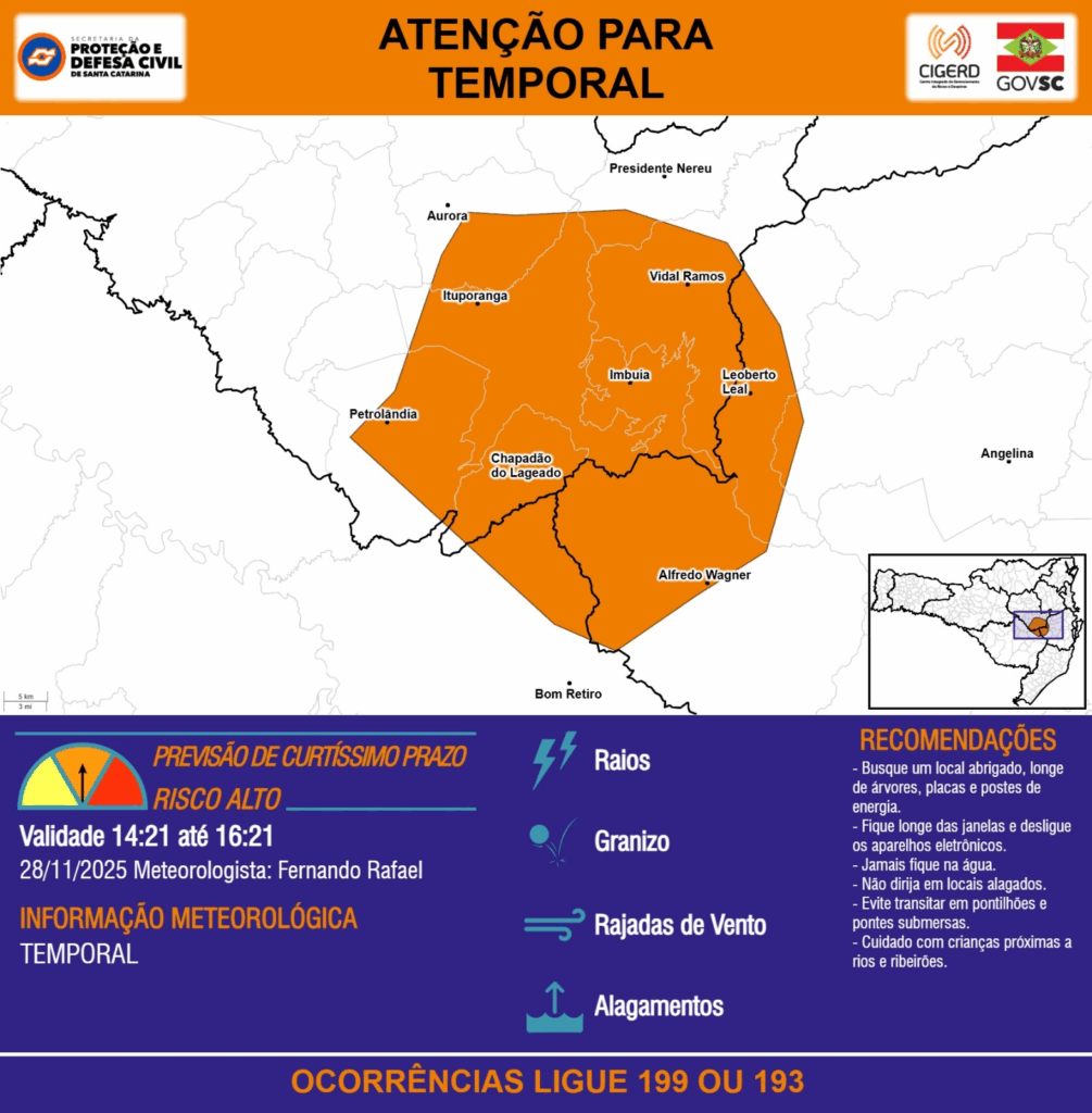 ATENÇÃO – 28/11 14:21 – TEMPORAL com RAIOS, GRANIZO, RAJADAS DE VENTO e ALAGAMENTOS para os municípios de Alfredo Wagner, Angelina, Aurora, Bom Retiro, Chapadão do Lageado, Imbuia, Ituporanga, Leoberto Leal, Petrolândia, Presidente Nereu e Vidal Ramos nas próximas 2 horas. Ocorrências ligue 199 ou 193.