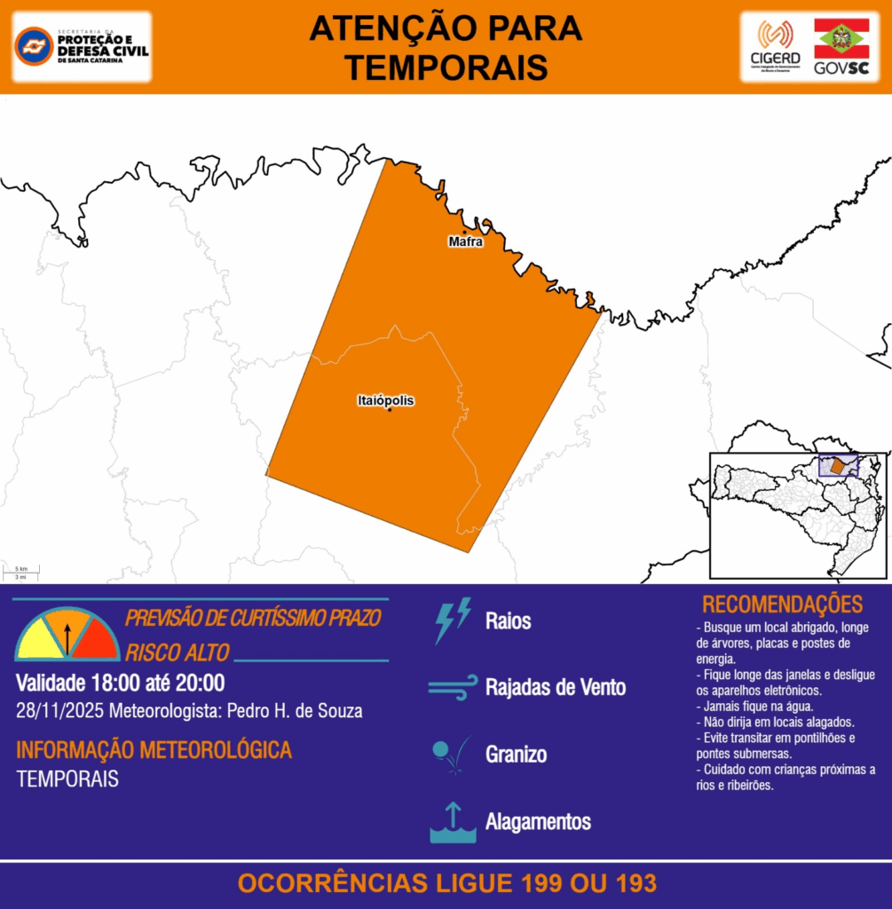 ATENÇÃO – 28/11 18:00 – TEMPORAIS com RAIOS, RAJADAS DE VENTO, GRANIZO e ALAGAMENTOS para os municípios de Itaiópolis e Mafra nas próximas 2 horas. Ocorrências ligue 199 ou 193.