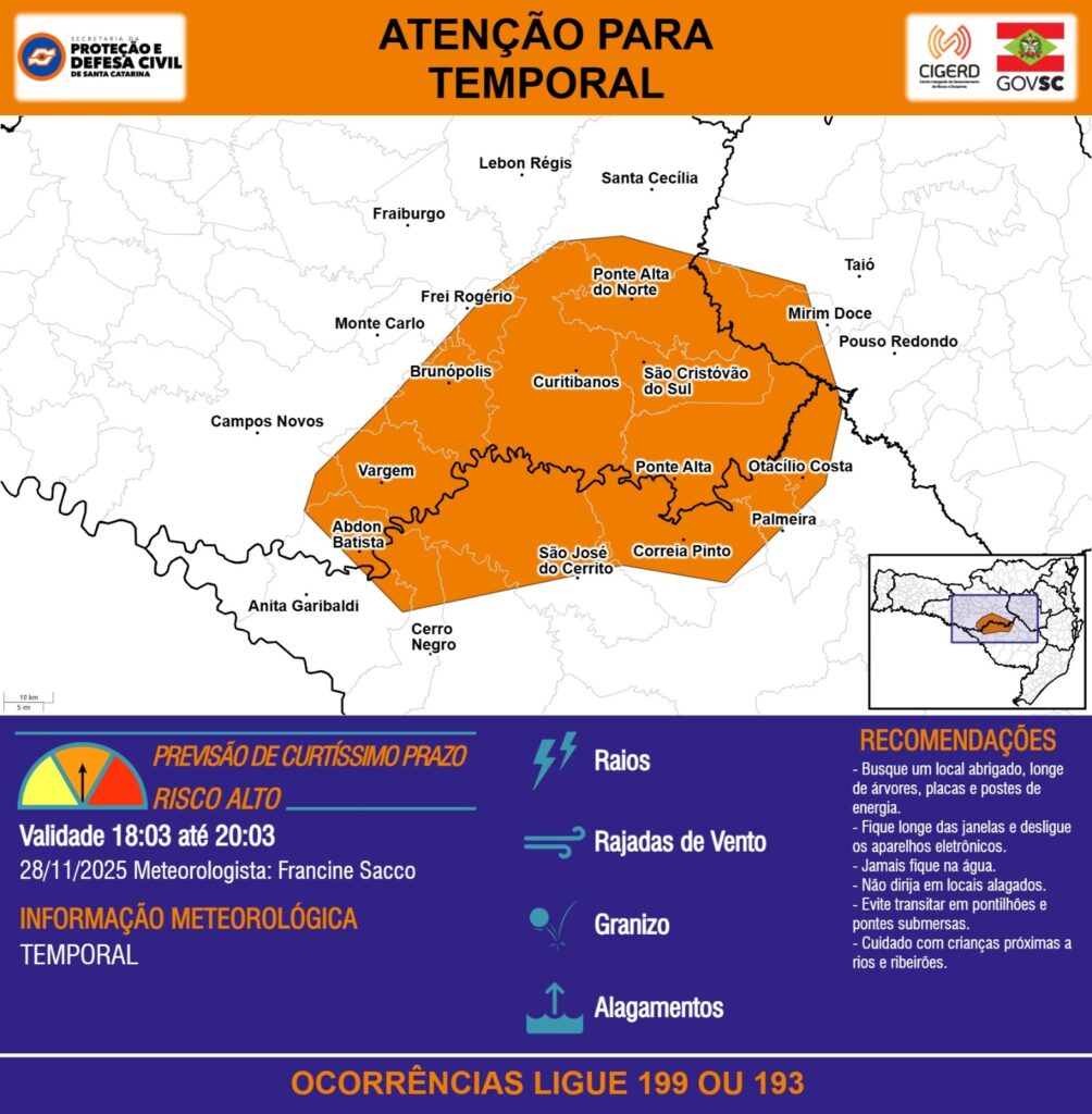 ATENÇÃO – 28/11 18:03 – TEMPORAL com RAIOS, RAJADAS DE VENTO, GRANIZO e ALAGAMENTOS para as regiões do Meio-Oeste, Planalto Sul e Alto Vale do Itajaí nas próximas 2 horas. Ocorrências ligue 199 ou 193.