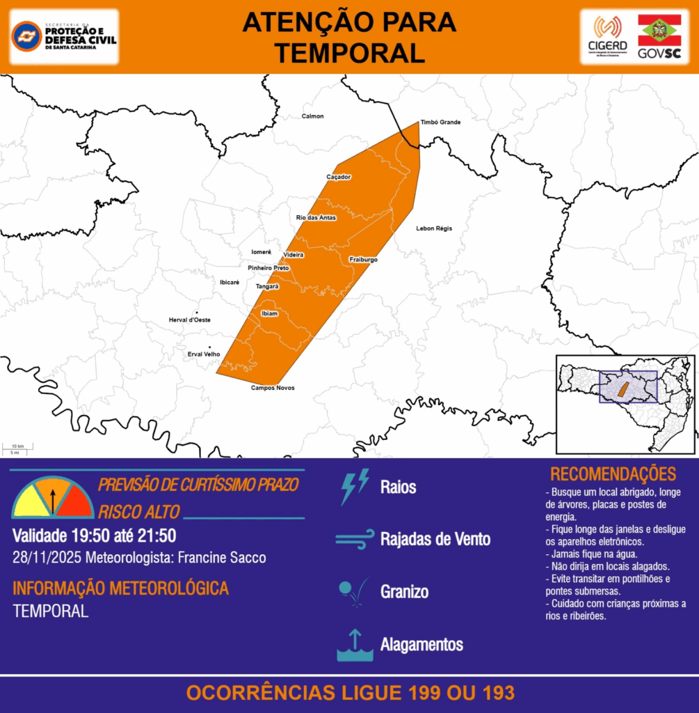 ATENÇÃO – 28/11 19:50 – TEMPORAL com RAIOS, RAJADAS DE VENTO, GRANIZO e ALAGAMENTOS para as regiões do Meio-Oeste e Planalto Norte nas próximas 2 horas. Ocorrências ligue 199 ou 193.
