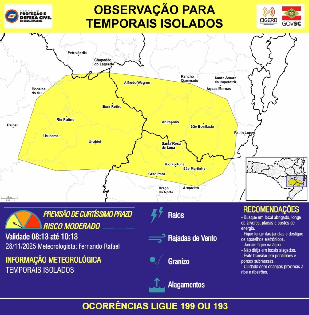 OBSERVAÇÃO – 28/11 08:13 – TEMPORAIS ISOLADOS com RAIOS, RAJADAS DE VENTO, GRANIZO e ALAGAMENTOS pontuais para os municípios de Alfredo Wagner, Anitápolis, Armazém, Bocaina do Sul, Bom Retiro, Braço do Norte, Chapadão do Lageado, Grão Pará, Painel, Paulo Lopes, Petrolândia, Rancho Queimado, Rio Fortuna, Rio Rufino, Santa Rosa de Lima, Santo Amaro da Imperatriz, São Bonifácio, São Martinho, Urubici, Urupema e Águas Mornas nas próximas 2 horas. Ocorrências ligue 199 ou 193.