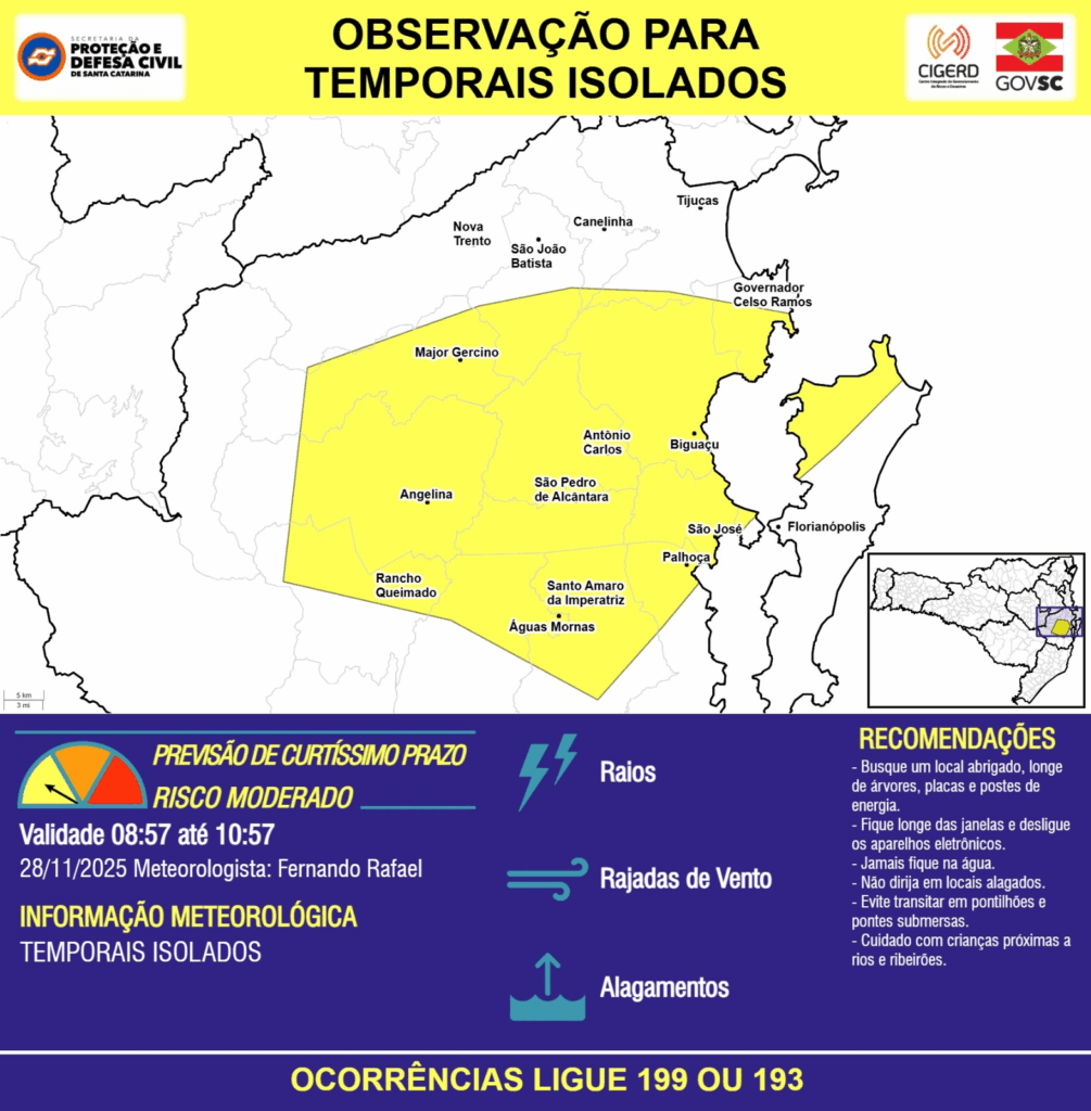 OBSERVAÇÃO – 28/11 08:57 – TEMPORAIS ISOLADOS com RAIOS, RAJADAS DE VENTO e ALAGAMENTOS pontuais para os municípios de Angelina, Anitápolis, Antônio Carlos, Biguaçu, Canelinha, Florianópolis, Governador Celso Ramos, Major Gercino, Nova Trento, Palhoça, Rancho Queimado, Santo Amaro da Imperatriz, São Bonifácio, São José, São João Batista, São Pedro de Alcântara, Tijucas e Águas Mornas nas próximas 2 horas. Ocorrências ligue 199 ou 193.
