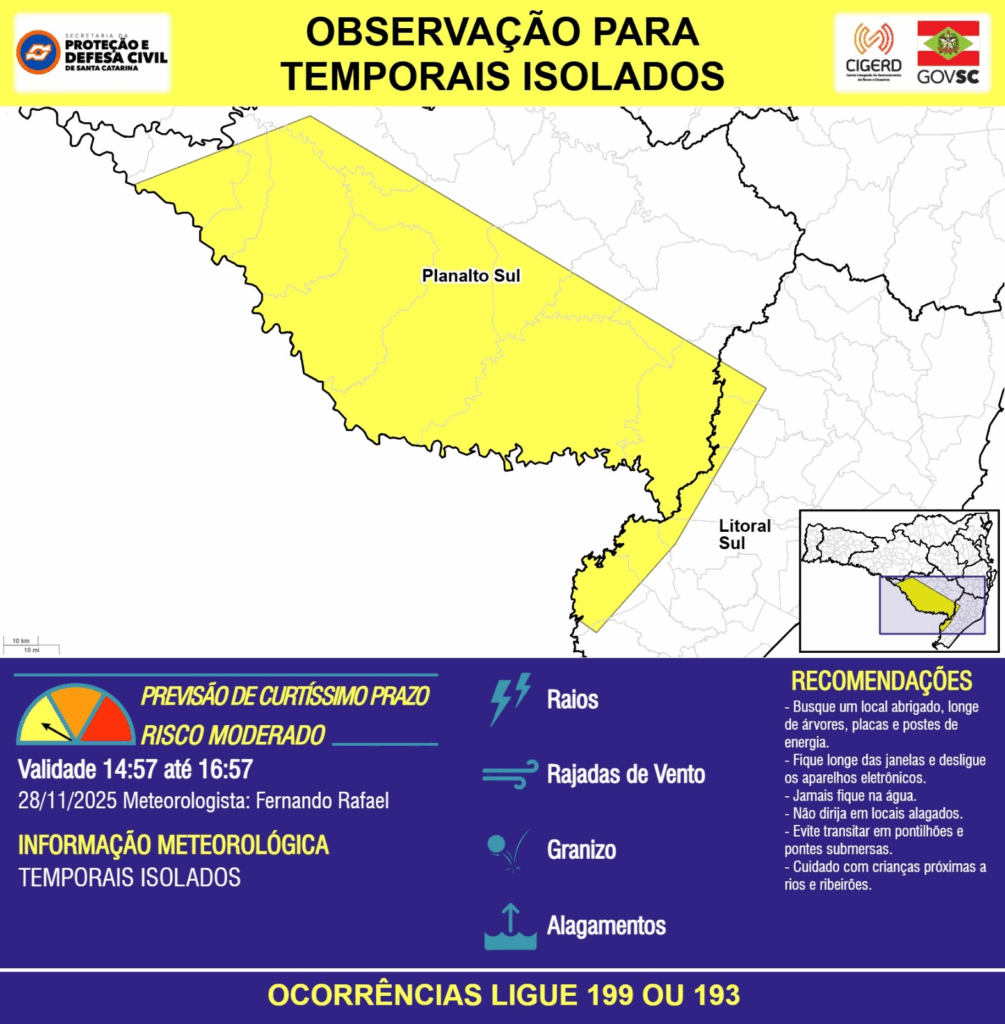 OBSERVAÇÃO – 28/11 14:57 – TEMPORAIS ISOLADOS com RAIOS, RAJADAS DE VENTO, GRANIZO e ALAGAMENTOS pontuais para os municípios de Anita Garibaldi, Bom Jardim da Serra, Campo Belo do Sul, Capão Alto, Cerro Negro, Jacinto Machado, Lages, Lauro Müller, Morro Grande, Nova Veneza, Orleans, Painel, Siderópolis, São Joaquim, São José do Cerrito, Timbé do Sul, Treviso, Turvo, Urubici e Urupema nas próximas 2 horas. Ocorrências ligue 199 ou 193.