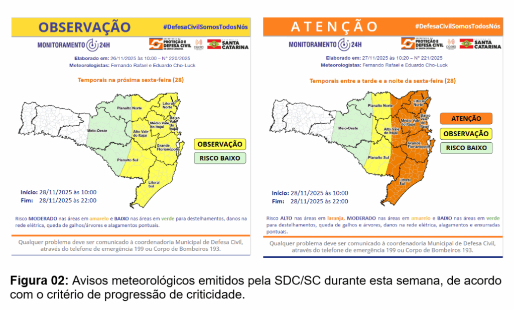 A Secretaria da Proteção e Defesa Civil de Santa Catarina alertou sobre estas condições desde a última quarta-feira (26), conforme mostram os Avisos Meteorológicos na Figura 02.