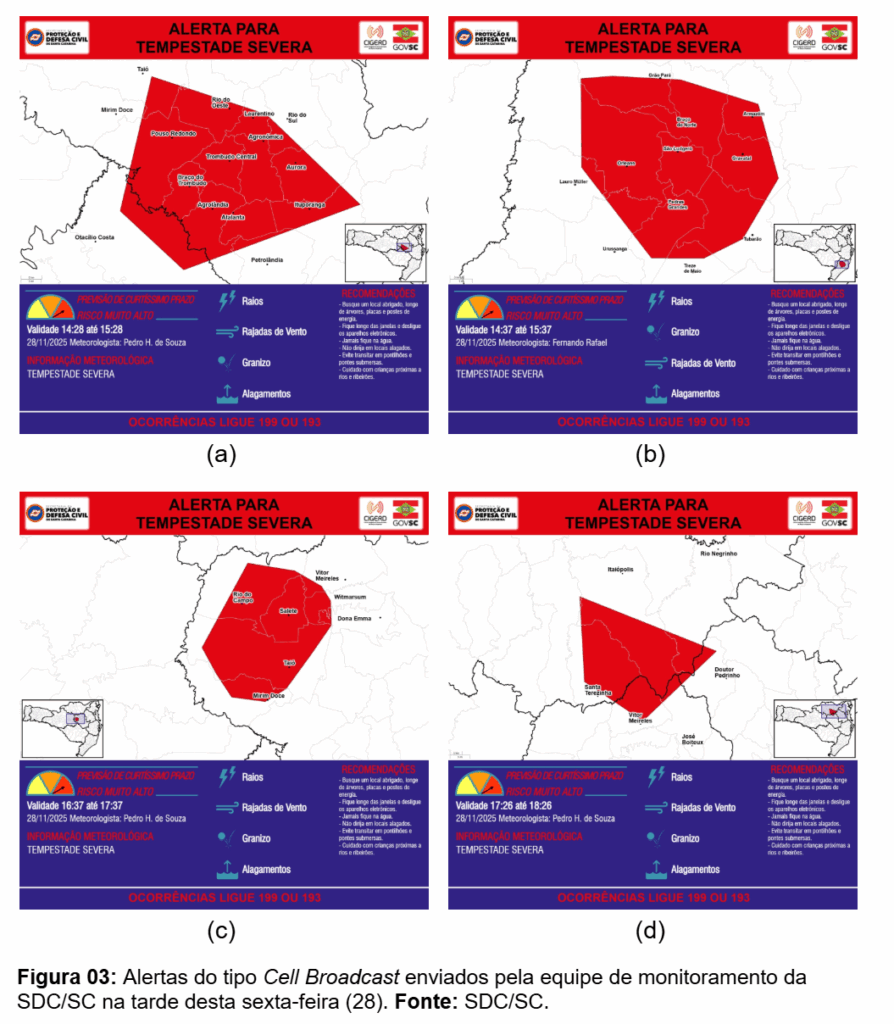 Além dos avisos previamente emitidos, a equipe de monitoramento fez a emissão de alertas em tempo real momentos antes das tempestades. Esses alertas são enviados via Whatsapp, SMS e através da ferramenta Cell Broadcast (Figura 03), informando a população sobre os riscos associados às tempestades.