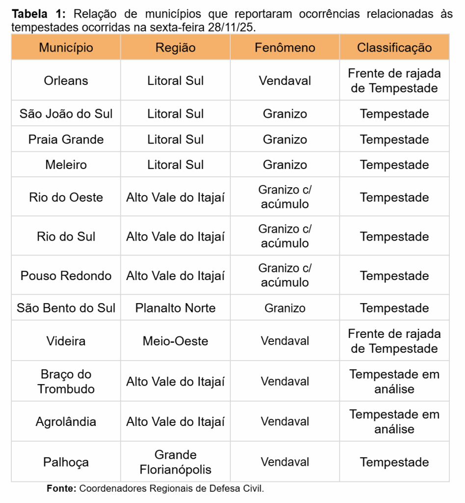 De acordo com as estações da SDC/SC, o município de Itaiópolis, no Planalto Norte, registrou rajadas de vento de 90km/h e em Trombudo Central as rajadas chegaram a 108,7km/h, mas ambos municípios não reportaram ocorrências associadas..