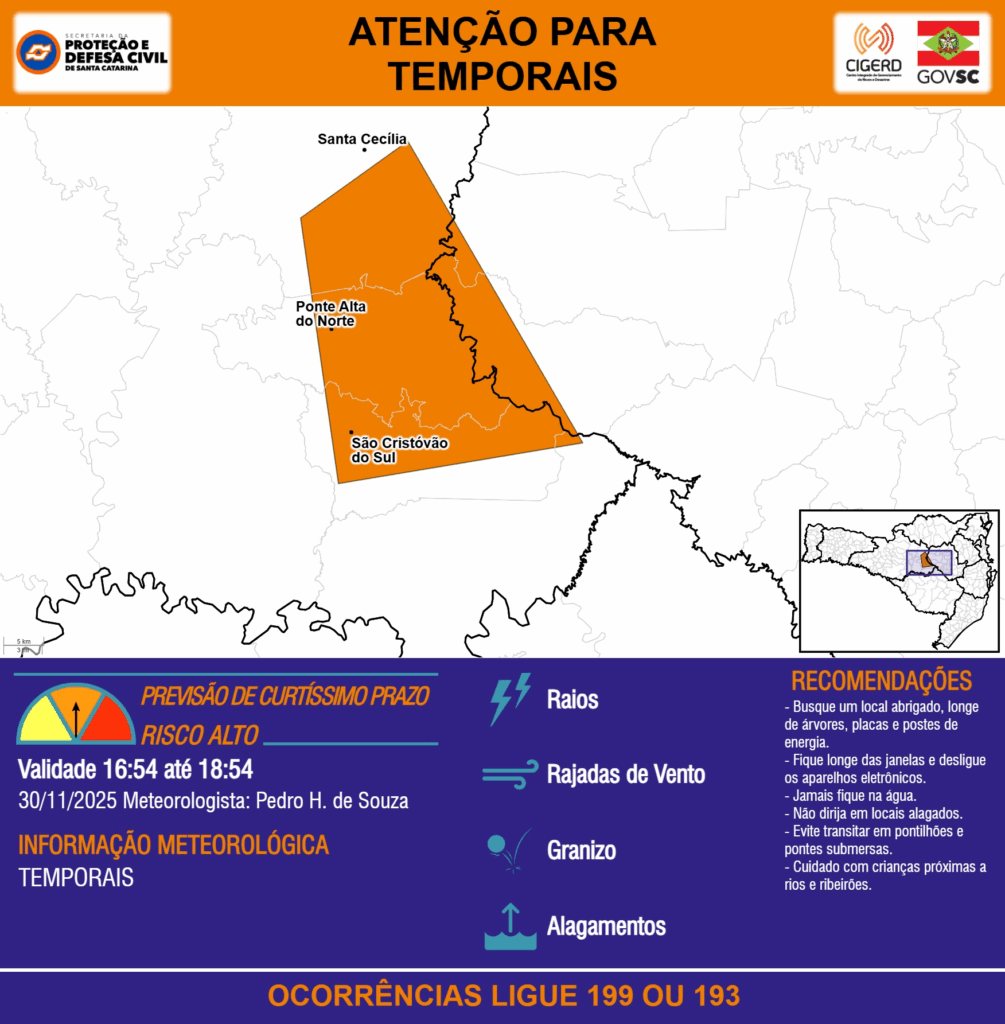ATENÇÃO – 30/11 16:54 – TEMPORAIS com RAIOS, RAJADAS DE VENTO, GRANIZO e ALAGAMENTOS para os municípios de Ponte Alta do Norte, Santa Cecília e São Cristóvão do Sul nas próximas 2 horas. Ocorrências ligue 199 ou 193.