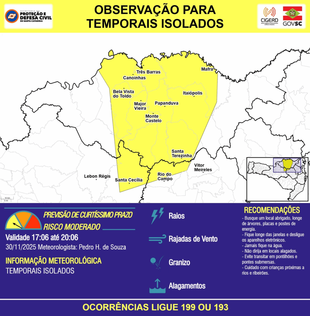 OBSERVAÇÃO – 30/11 17:06 – TEMPORAIS ISOLADOS com RAIOS, RAJADAS DE VENTO, GRANIZO e ALAGAMENTOS pontuais para os municípios de Bela Vista do Toldo, Canoinhas, Itaiópolis, Lebon Régis, Mafra, Major Vieira, Monte Castelo, Papanduva, Rio do Campo, Santa Cecília, Santa Terezinha, Três Barras e Vitor Meireles nas próximas 3 horas. Ocorrências ligue 199 ou 193.
