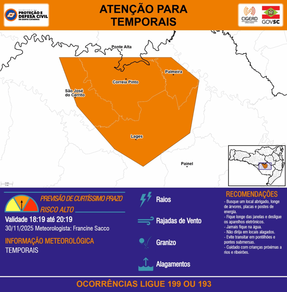 ATENÇÃO – 30/11 18:19 – TEMPORAIS com RAIOS, RAJADAS DE VENTO, GRANIZO e ALAGAMENTOS para os municípios de Correia Pinto, Lages, Painel, Palmeira, Ponte Alta e São José do Cerrito nas próximas 2 horas. Ocorrências ligue 199 ou 193.