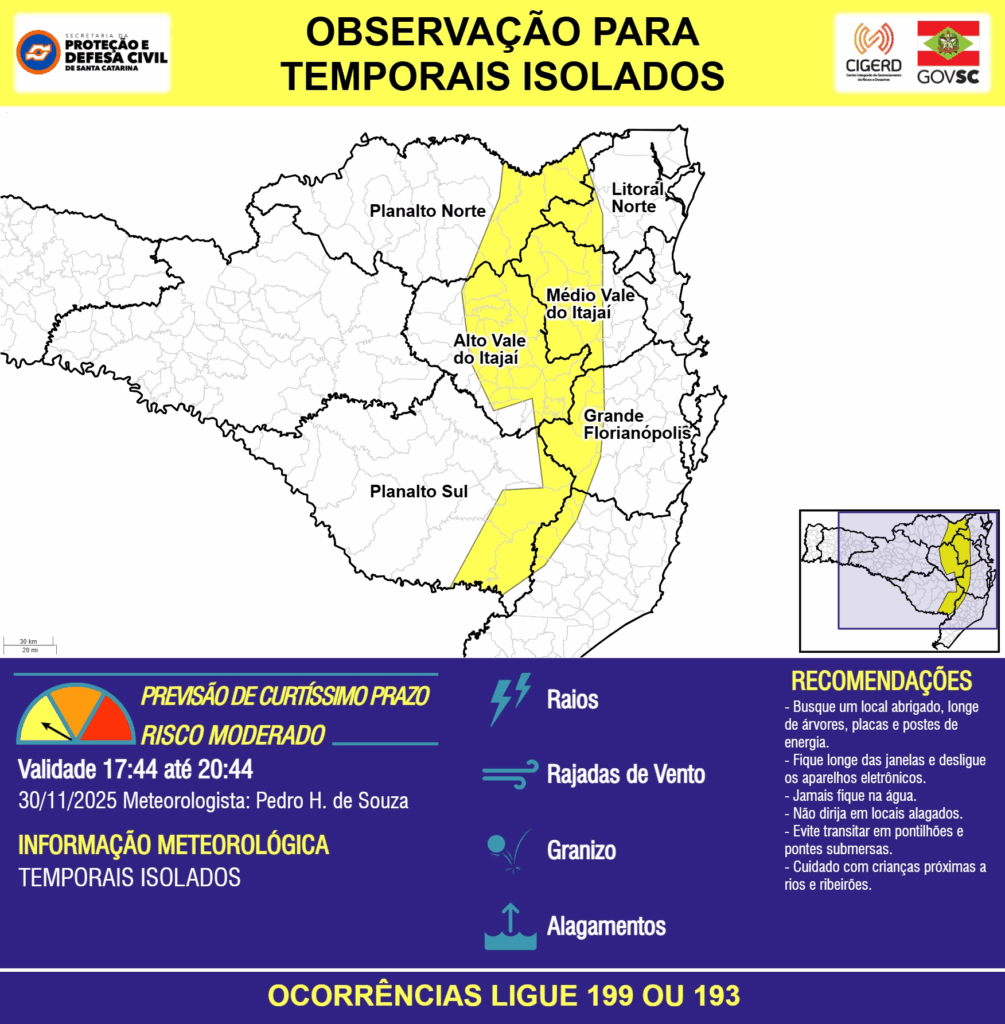 OBSERVAÇÃO – 30/11 17:44 – TEMPORAIS ISOLADOS com RAIOS, RAJADAS DE VENTO, GRANIZO e ALAGAMENTOS pontuais para as regiões do Planalto Norte, Litoral Norte, Planalto Sul, Grande Florianópolis, Médio e Alto Vale do Itajaí nas próximas 3 horas. Ocorrências ligue 199 ou 193.