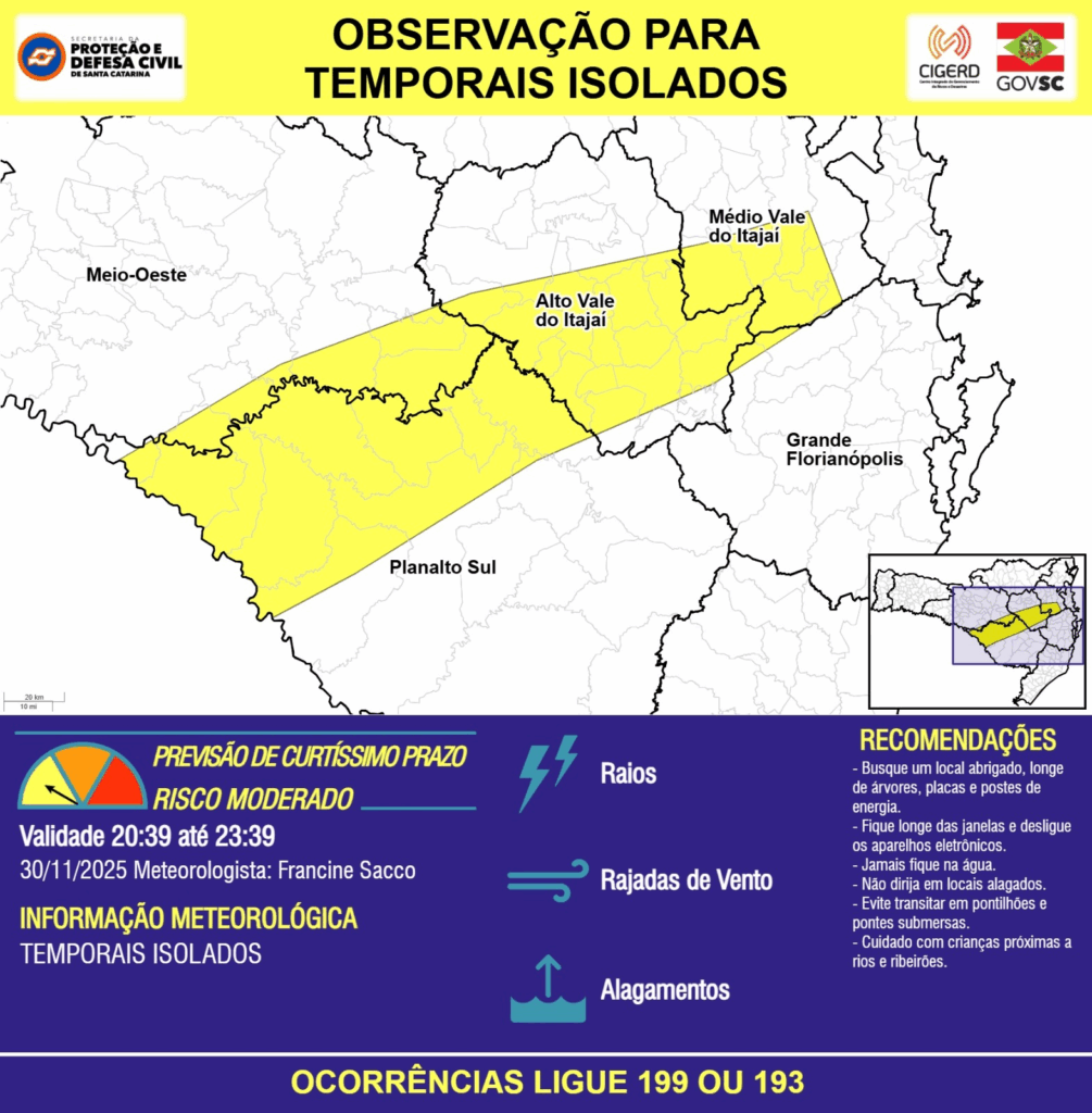 OBSERVAÇÃO – 30/11 20:39 – TEMPORAIS ISOLADOS com RAIOS, RAJADAS DE VENTO e ALAGAMENTOS pontuais para os municípios de Abdon Batista, Agrolândia, Agronômica, Anita Garibaldi, Apiúna, Ascurra, Atalanta, Aurora, Blumenau, Bocaina do Sul, Botuverá, Braço do Trombudo, Brunópolis, Brusque, Campo Belo do Sul, Campos Novos, Capão Alto, Celso Ramos, Cerro Negro, Chapadão do Lageado, Correia Pinto, Curitibanos, Gaspar, Guabiruba, Ibirama, Imbuia, Indaial, Ituporanga, Lages, Laurentino, Leoberto Leal, Lontras, Mirim Doce, Nova Trento, Otacílio Costa, Palmeira, Petrolândia, Ponte Alta, Ponte Alta do Norte, Pouso Redondo, Presidente Getúlio, Presidente Nereu, Rio do Oeste, Rio do Sul, São Cristóvão do Sul, São José do Cerrito, Taió, Trombudo Central, Vargem e Vidal Ramos nas próximas 3 horas. Ocorrências ligue 199 ou 193.