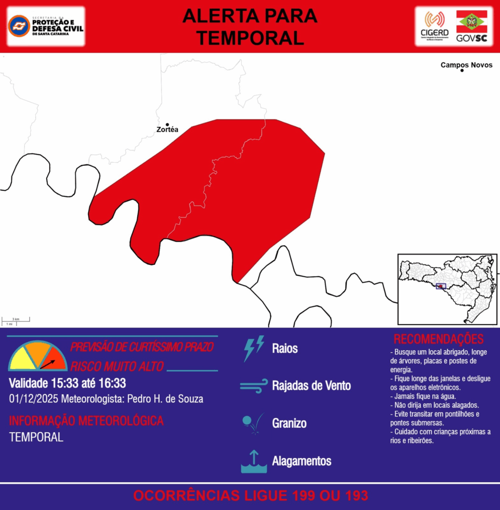 ALERTA – 01/12 15:33 – TEMPORAL com RAIOS, RAJADAS DE VENTO, GRANIZO e ALAGAMENTOS para os municípios de Campos Novos e Zortéa na próxima hora. Ocorrências ligue 199 ou 193.