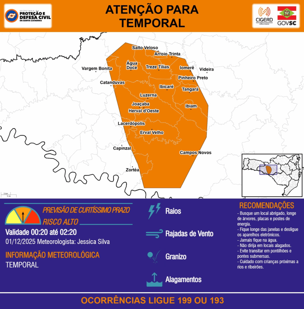 ATENÇÃO – 01/12 00:20 – TEMPORAL com RAIOS, RAJADAS DE VENTO, GRANIZO e ALAGAMENTOS para os municípios de Arroio Trinta, Campos Novos, Capinzal, Catanduvas, Erval Velho, Herval d’Oeste, Ibiam, Ibicaré, Iomerê, Joaçaba, Lacerdópolis, Luzerna, Pinheiro Preto, Salto Veloso, Tangará, Treze Tílias, Vargem Bonita, Videira, Zortéa e Água Doce nas próximas 2 horas. Ocorrências ligue 199 ou 193.