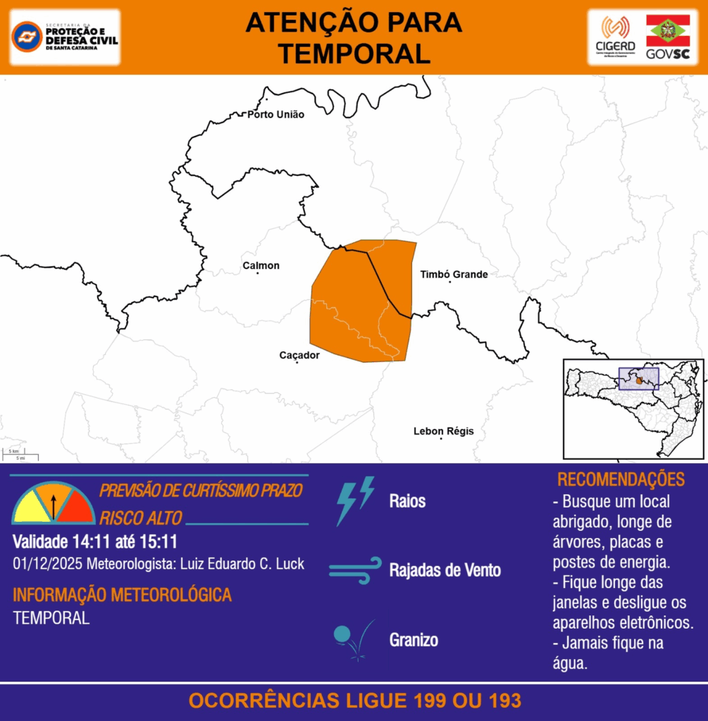 ATENÇÃO – 01/12 14:11 – TEMPORAL com RAIOS, RAJADAS DE VENTO e GRANIZO para os municípios de Calmon, Caçador, Lebon Régis, Porto União e Timbó Grande na próxima hora. Ocorrências ligue 199 ou 193.