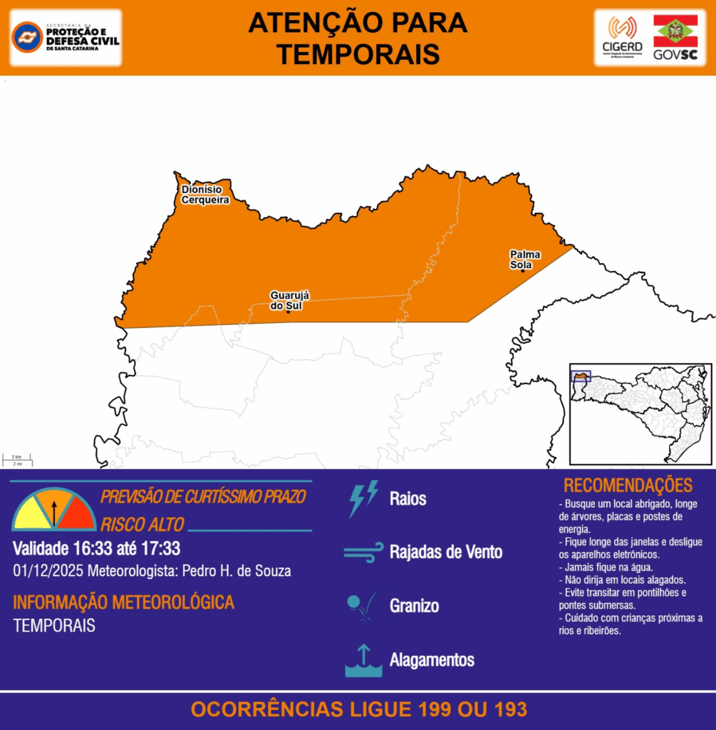 ATENÇÃO – 01/12 16:33 – TEMPORAIS com RAIOS, RAJADAS DE VENTO, GRANIZO e ALAGAMENTOS para os municípios de Dionísio Cerqueira, Guarujá do Sul e Palma Sola na próxima hora. Ocorrências ligue 199 ou 193.