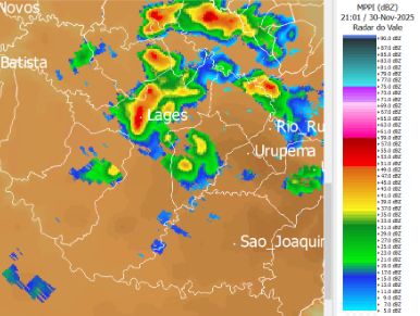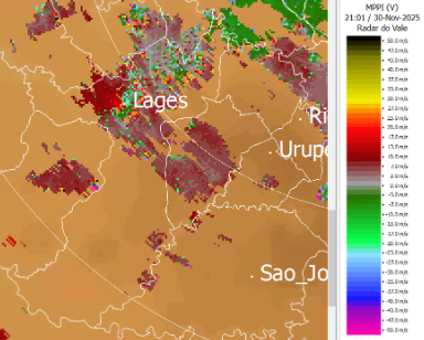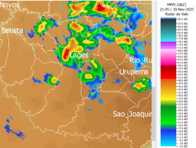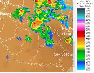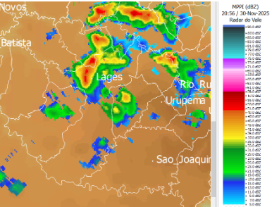 De acordo com o radar meteorológico de Lontras, o temporal se formou e se intensificou rapidamente próximo à região central de Lages (Figuras 2 a 5). A rápida intensificação dos temporais é muito característica desta época do ano e ocorre por conta do calor e umidade disponíveis.