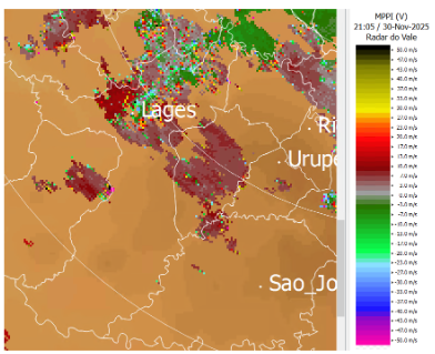 Os campos de velocidade radial (Figuras 6 e 7), que estimam a velocidade do vento, mostram a presença de rotação no sistema, um mesociclone, condição característica de temporais com rajadas de vento. A rotação é sinalizada pela presença de um dipolo de ventos (tons de verde e vermelho no mapa), com valores estimados entre 70 e 80 km/h em Lages, mas que localmente podem ter sido mais intensos.