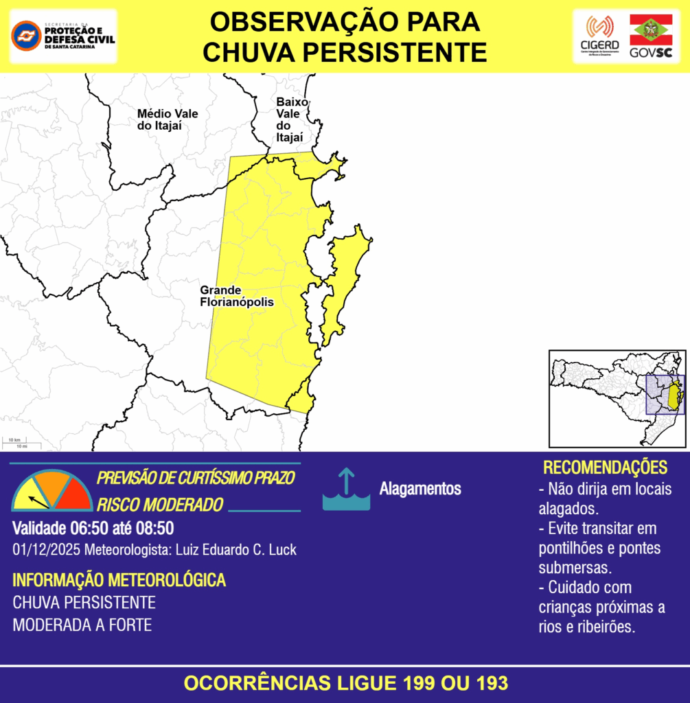 OBSERVAÇÃO – 01/12 06:50 – CHUVA PERSISTENTE de intensidade moderada a forte com ALAGAMENTOS pontuais para as regiões do Litoral Sul, Grande Florianópolis, Baixo e Médio Vale do Itajaí nas próximas 2 horas. Ocorrências ligue 199 ou 193.