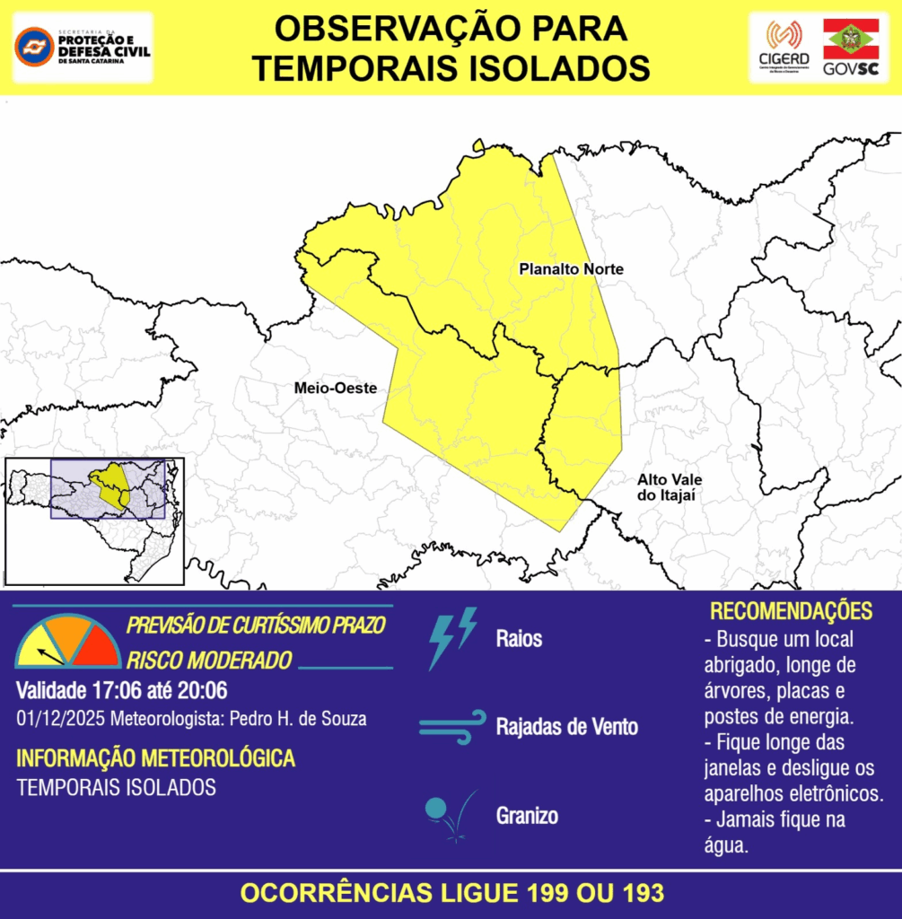 OBSERVAÇÃO – 01/12 17:06 – TEMPORAIS ISOLADOS com RAIOS, RAJADAS DE VENTO e GRANIZO para as regiões do Meio-Oeste, Planalto Norte e Alto Vale do Itajaí nas próximas 3 horas. Ocorrências ligue 199 ou 193.