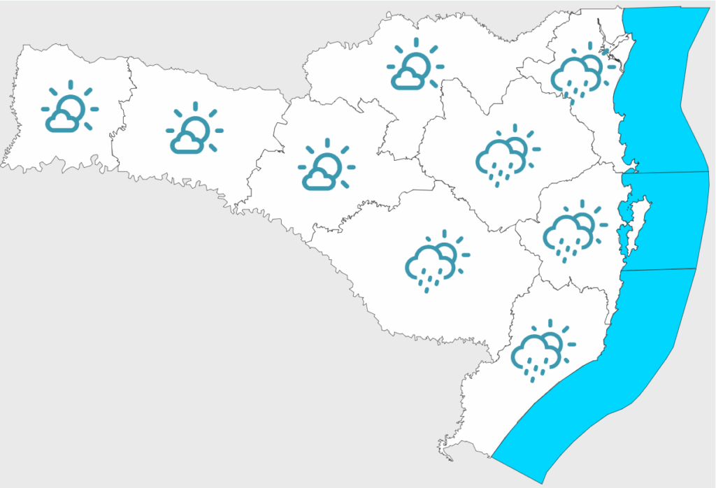 Na quarta-feira (03) as condições para temporais diminuem e o tempo firme predomina no Grande Oeste, com sol entre poucas nuvens. No Litoral e em áreas próximas, a circulação marítima deixa o tempo instável, com variação de nebulosidade e condições para chuva fraca e isolada a qualquer hora. Não há risco para ocorrências associadas às condições de tempo. As temperaturas sobem gradativamente ao longo do dia e as máximas variam entre 26 e 29°C em grande parte do estado. Nas regiões de serra, os termômetros não passam dos 23°C e no Litoral ficam próximas dos 25°C.