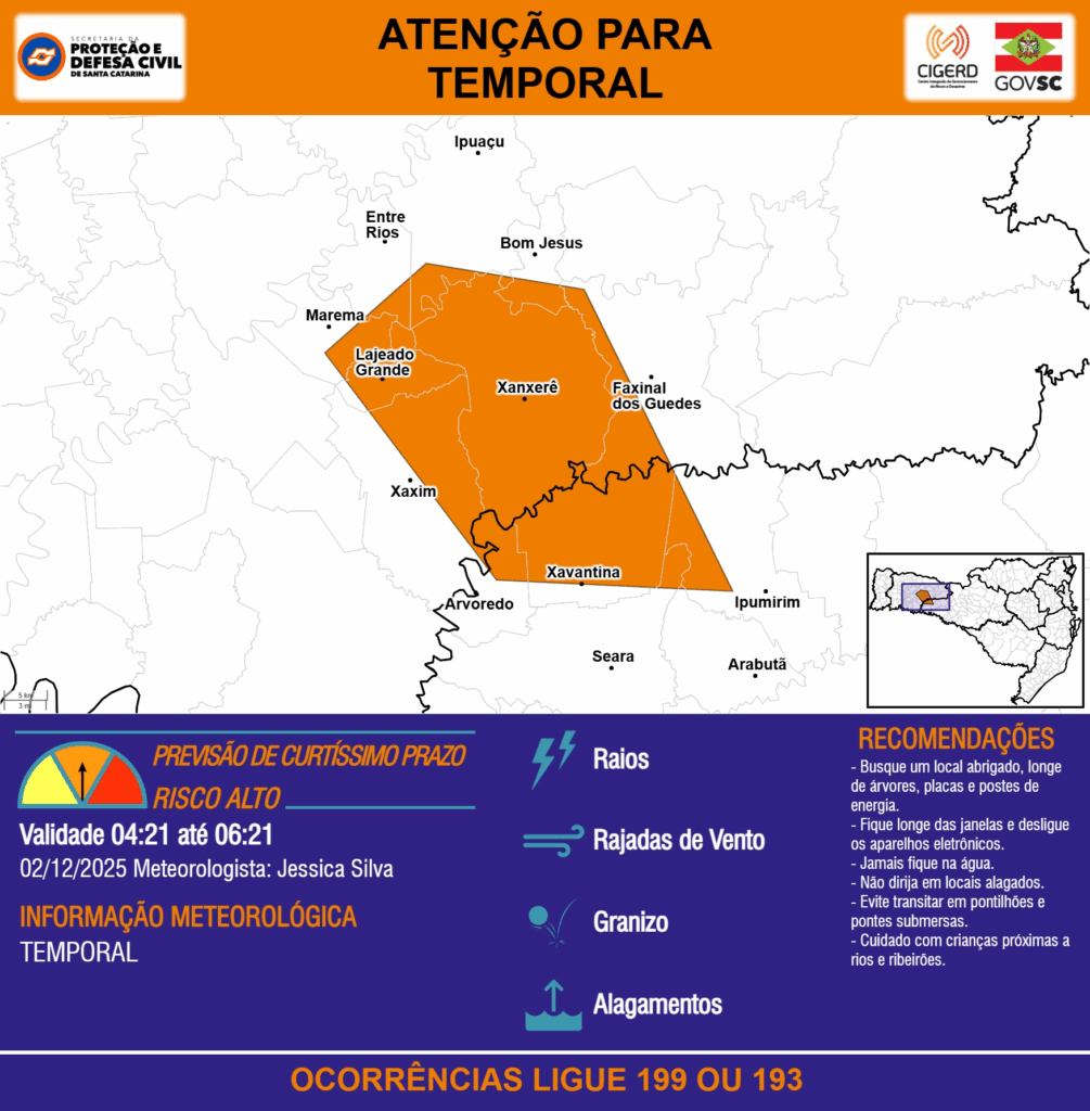 ATENÇÃO – 02/12 04:21 – TEMPORAL com RAIOS, RAJADAS DE VENTO, GRANIZO e ALAGAMENTOS para os municípios de Arabutã, Arvoredo, Bom Jesus, Entre Rios, Faxinal dos Guedes, Ipuaçu, Ipumirim, Lajeado Grande, Marema, Seara, Xanxerê, Xavantina e Xaxim nas próximas 2 horas. Ocorrências ligue 199 ou 193.