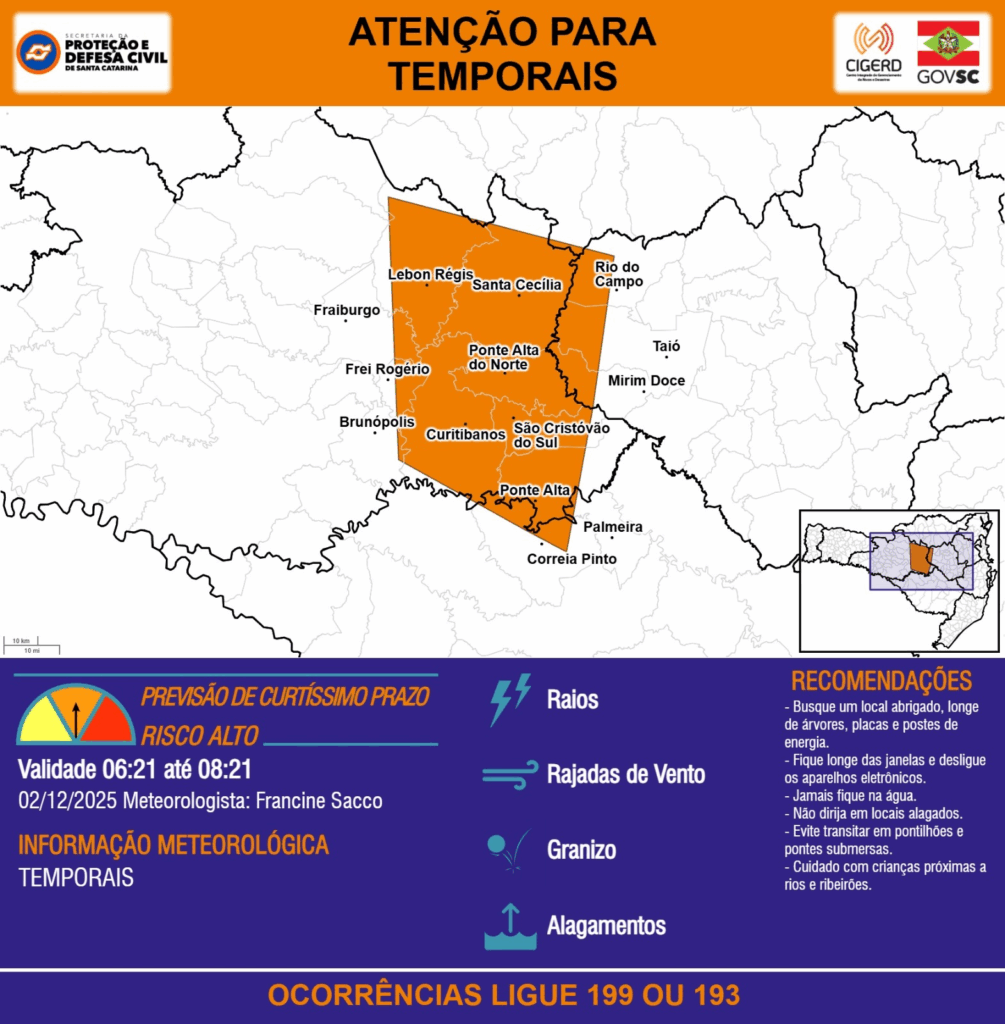 ATENÇÃO – 02/12 06:21 – TEMPORAIS com RAIOS, RAJADAS DE VENTO, GRANIZO e ALAGAMENTOS para as regiões do Meio-Oeste, Planalto Sul e Alto Vale do Itajaí nas próximas 2 horas. Ocorrências ligue 199 ou 193.