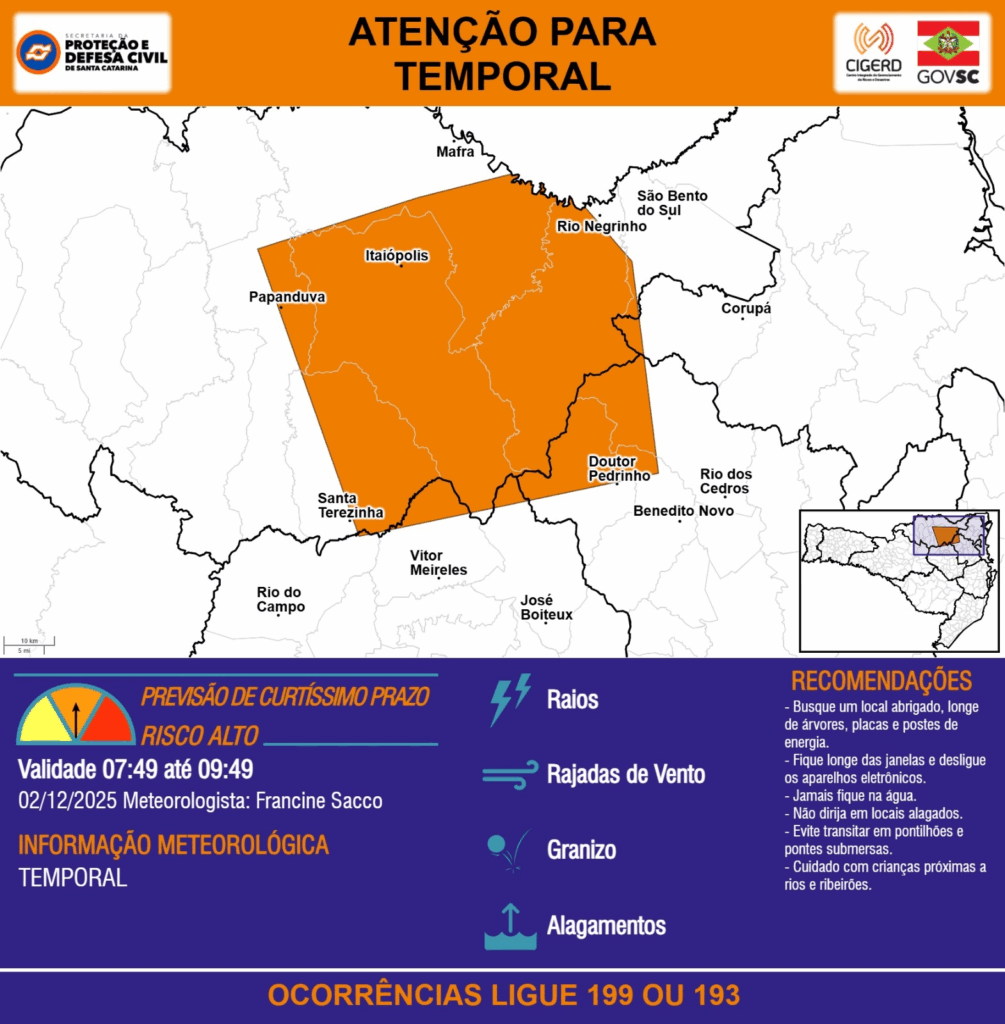 ATENÇÃO – 02/12 07:49 – TEMPORAL com RAIOS, RAJADAS DE VENTO, GRANIZO e ALAGAMENTOS para as regiões do Planalto Norte, Litoral Norte, Médio e Alto Vale do Itajaí nas próximas 2 horas. Ocorrências ligue 199 ou 193.