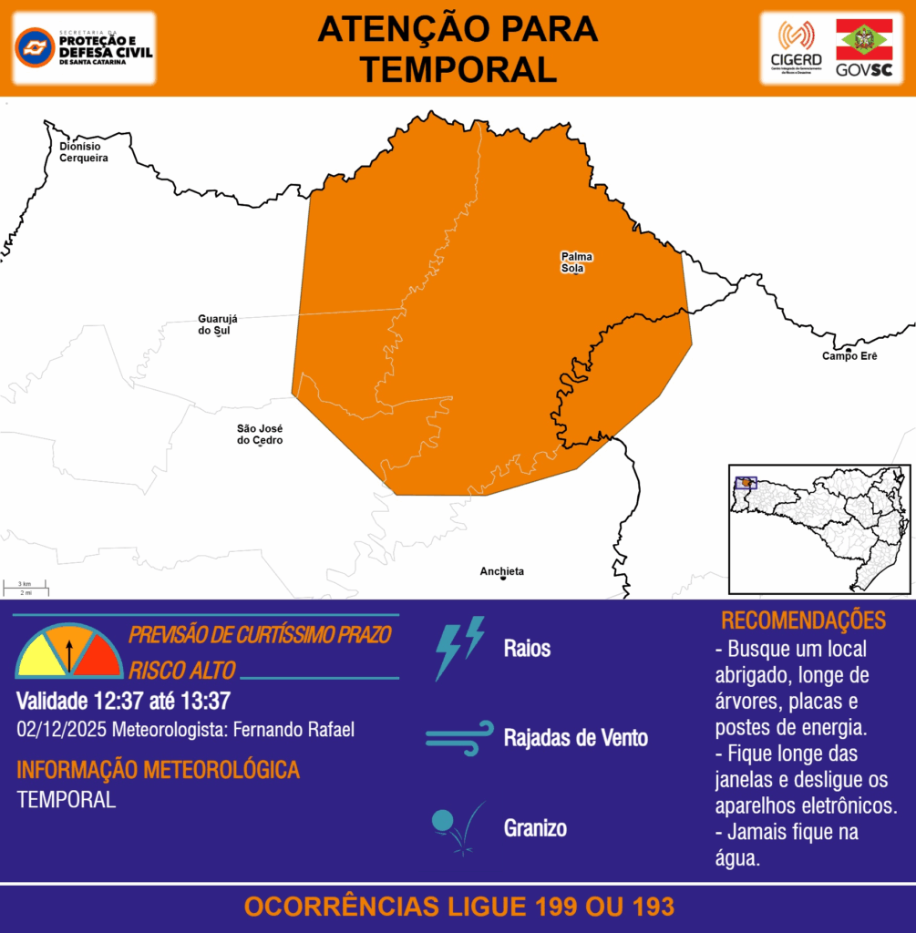 ATENÇÃO – 02/12 12:37 – TEMPORAL com RAIOS, RAJADAS DE VENTO e GRANIZO para os municípios de Anchieta, Campo Erê, Dionísio Cerqueira, Guarujá do Sul, Palma Sola e São José do Cedro na próxima hora. Ocorrências ligue 199 ou 193.