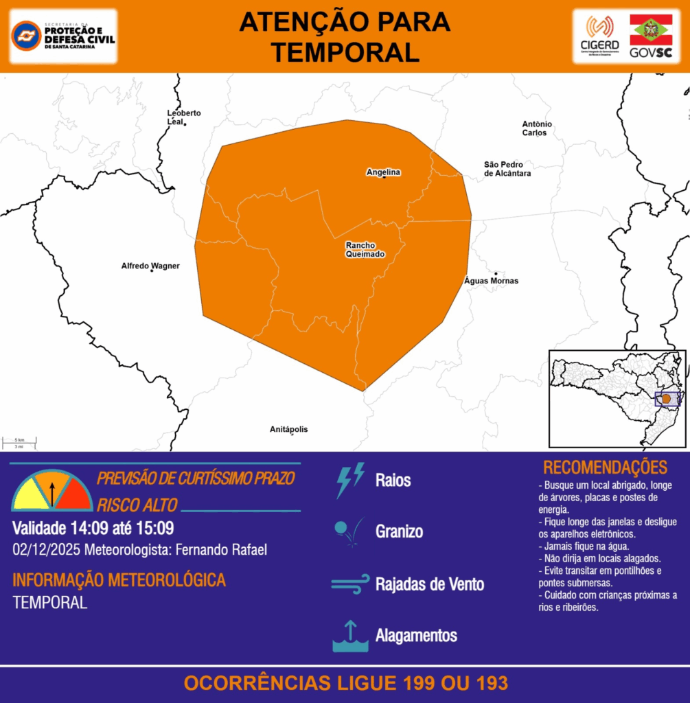 ATENÇÃO – 02/12 14:09 – TEMPORAL com RAIOS, GRANIZO, RAJADAS DE VENTO e ALAGAMENTOS para os municípios de Alfredo Wagner, Angelina, Anitápolis, Antônio Carlos, Leoberto Leal, Rancho Queimado, São Pedro de Alcântara e Águas Mornas na próxima hora. Ocorrências ligue 199 ou 193.