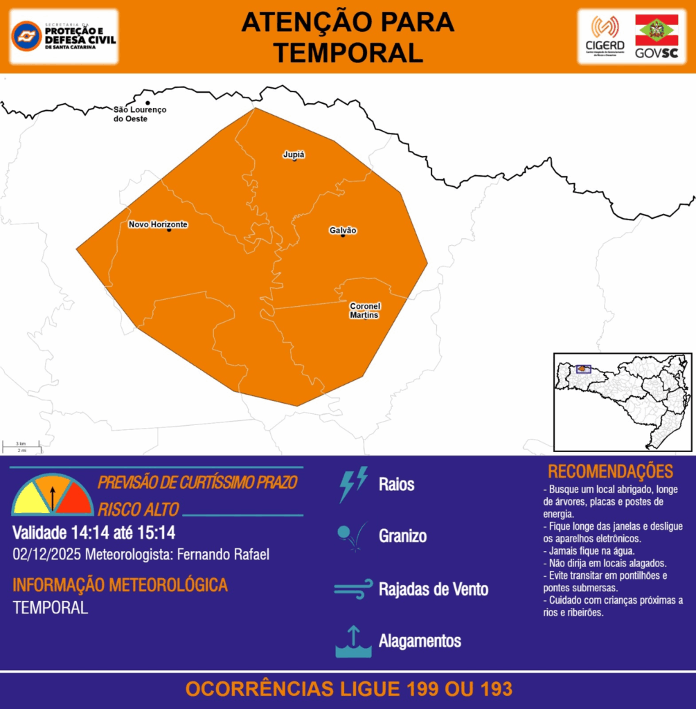ATENÇÃO – 02/12 14:14 – TEMPORAL com RAIOS, GRANIZO, RAJADAS DE VENTO e ALAGAMENTOS para os municípios de Coronel Martins, Galvão, Jupiá, Novo Horizonte e São Lourenço do Oeste na próxima hora. Ocorrências ligue 199 ou 193.
