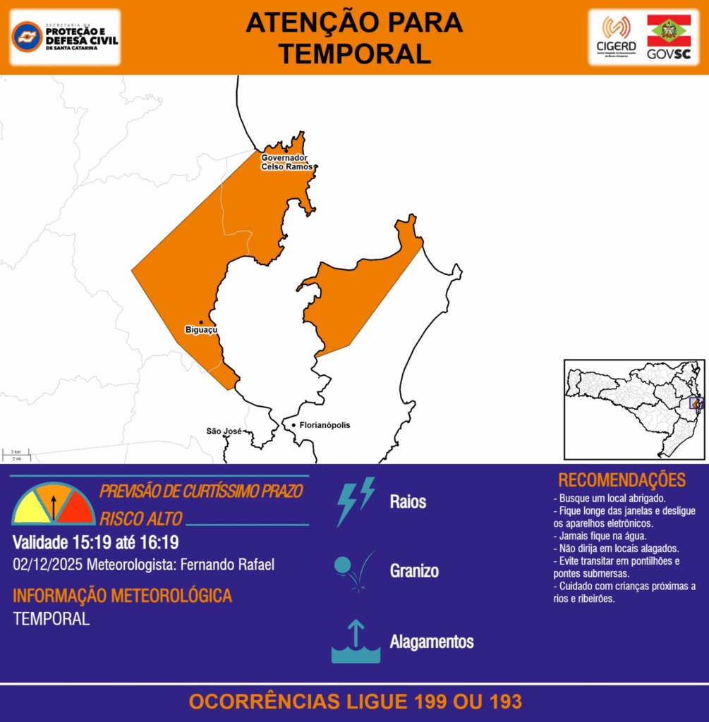 ATENÇÃO – 02/12 15:19 – TEMPORAL com RAIOS, GRANIZO e ALAGAMENTOS para os municípios de Biguaçu, Florianópolis, Governador Celso Ramos, São José na próxima hora. Ocorrências ligue 199 ou 193.