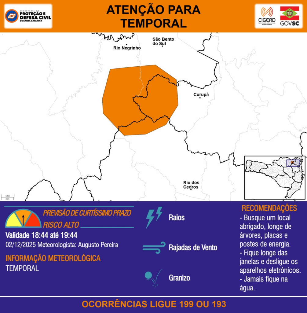 ATENÇÃO – 02/12 18:44 – TEMPORAL com RAIOS, RAJADAS DE VENTO e GRANIZO para os municípios de Corupá, Rio Negrinho, Rio dos Cedros e São Bento do Sul na próxima hora. Ocorrências ligue 199 ou 193.