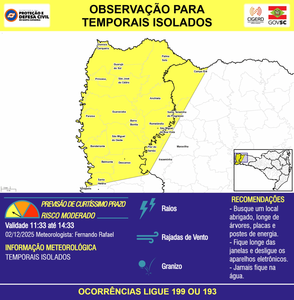 OBSERVAÇÃO – 02/12 11:33 – TEMPORAIS ISOLADOS com RAIOS, RAJADAS DE VENTO e GRANIZO para os municípios de Anchieta, Bandeirante, Barra Bonita, Belmonte, Campo Erê, Descanso, Dionísio Cerqueira, Flor do Sertão, Guaraciaba, Guarujá do Sul, Iraceminha, Maravilha, Palma Sola, Paraíso, Princesa, Romelândia, Santa Helena, Santa Terezinha do Progresso, São José do Cedro, São Miguel da Boa Vista, São Miguel do Oeste e Tunápolis nas próximas 3 horas. Ocorrências ligue 199 ou 193.