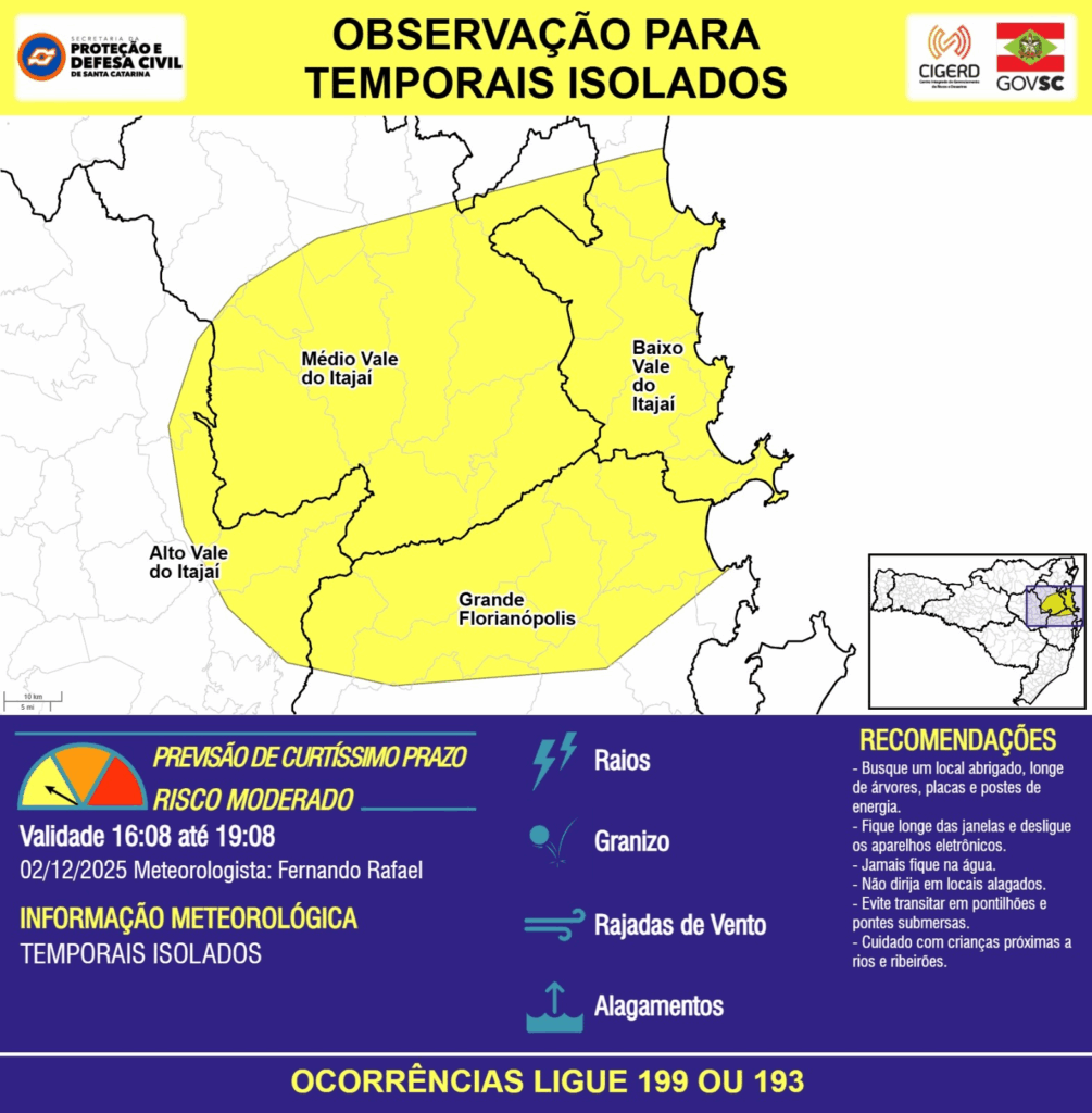 OBSERVAÇÃO – 02/12 16:08 – TEMPORAIS ISOLADOS com RAIOS, GRANIZO, RAJADAS DE VENTO e ALAGAMENTOS pontuais para as regiões do Grande Florianópolis, Baixo, Médio e Alto Vale do Itajaí nas próximas 3 horas. Ocorrências ligue 199 ou 193.