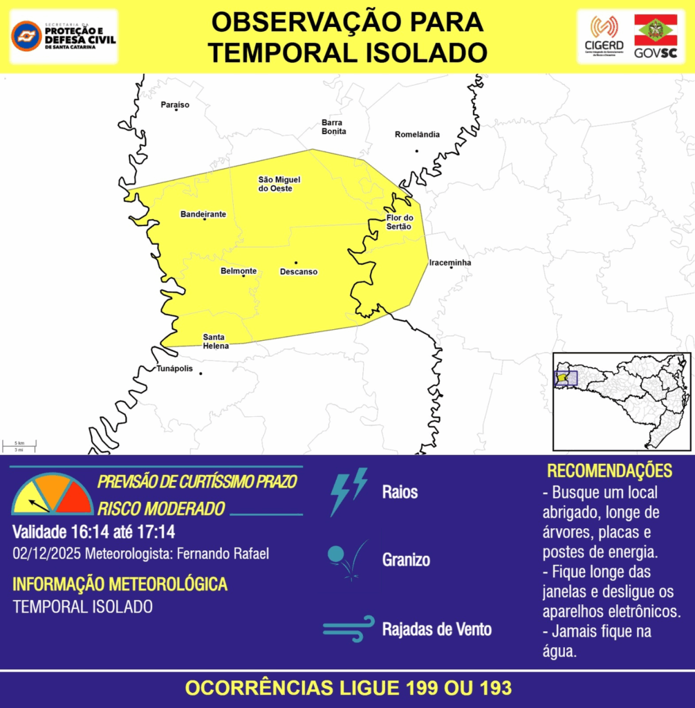 OBSERVAÇÃO – 02/12 16:14 – TEMPORAL ISOLADO com RAIOS, GRANIZO e RAJADAS DE VENTO para os municípios de Bandeirante, Barra Bonita, Belmonte, Descanso, Flor do Sertão, Iraceminha, Paraíso, Romelândia, Santa Helena, São Miguel do Oeste e Tunápolis na próxima hora. Ocorrências ligue 199 ou 193.