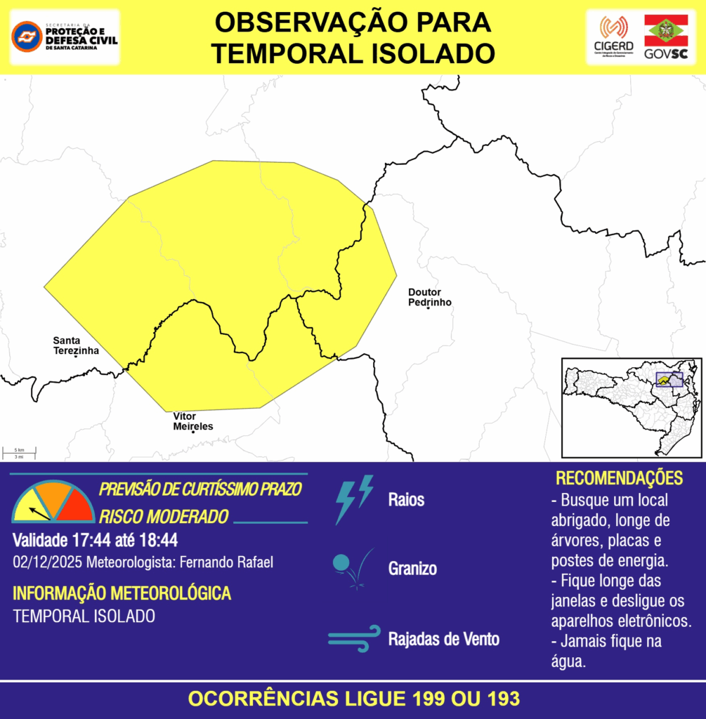 OBSERVAÇÃO – 02/12 17:44 – TEMPORAL ISOLADO com RAIOS, GRANIZO e RAJADAS DE VENTO para os municípios de Doutor Pedrinho, Itaiópolis, Rio Negrinho, Santa Terezinha e Vitor Meireles na próxima hora. Ocorrências ligue 199 ou 193.