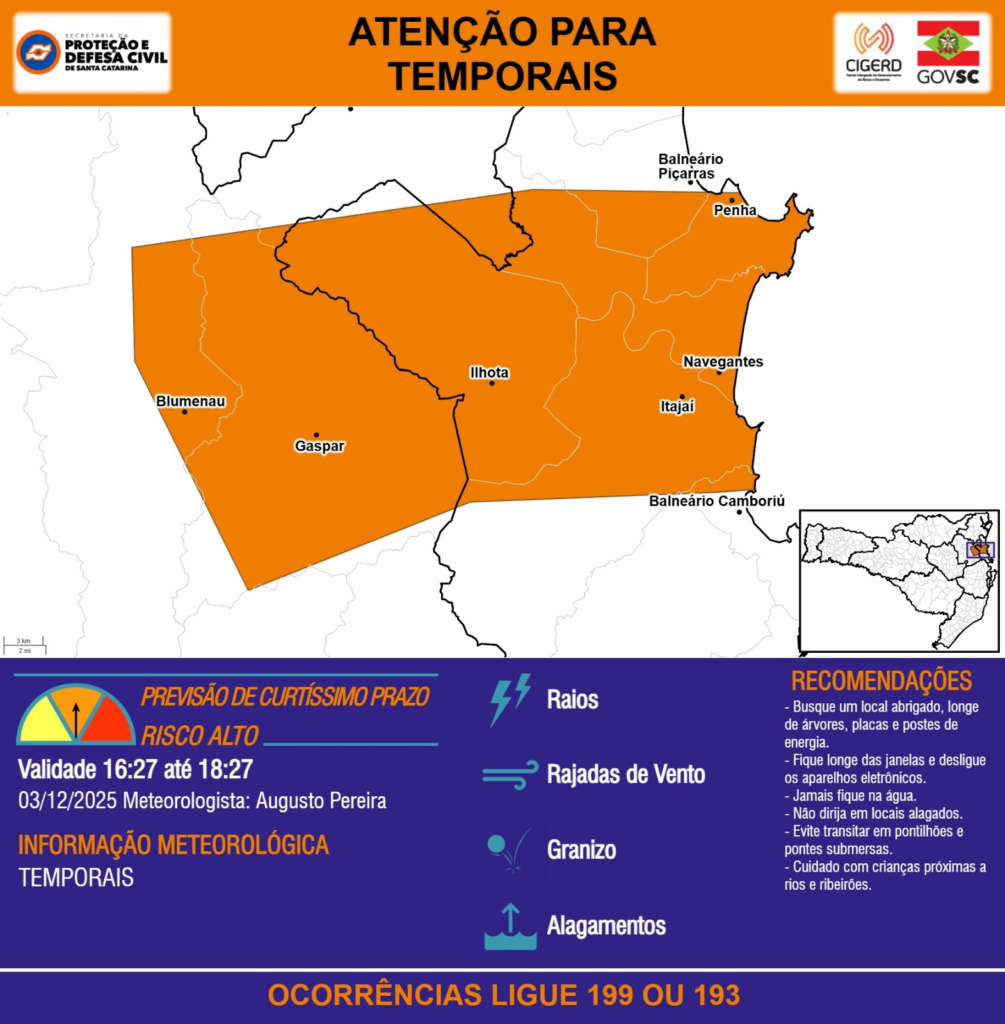ATENÇÃO – 03/12 16:27 – TEMPORAIS com RAIOS, RAJADAS DE VENTO, GRANIZO e ALAGAMENTOS para os municípios de Balneário Camboriú, Balneário Piçarras, Blumenau, Gaspar, Ilhota, Itajaí, Luiz Alves, Navegantes e Penha nas próximas 2 horas. Ocorrências ligue 199 ou 193.