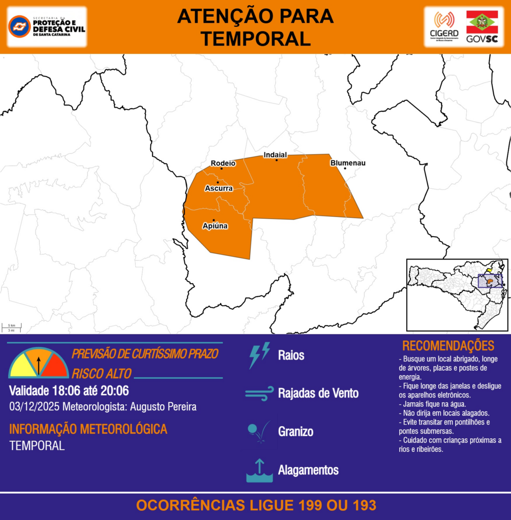 ATENÇÃO – 03/12 18:06 – TEMPORAL com RAIOS, RAJADAS DE VENTO, GRANIZO e ALAGAMENTOS para os municípios de Apiúna, Ascurra, Blumenau, Indaial e Rodeio nas próximas 2 horas. Ocorrências ligue 199 ou 193.