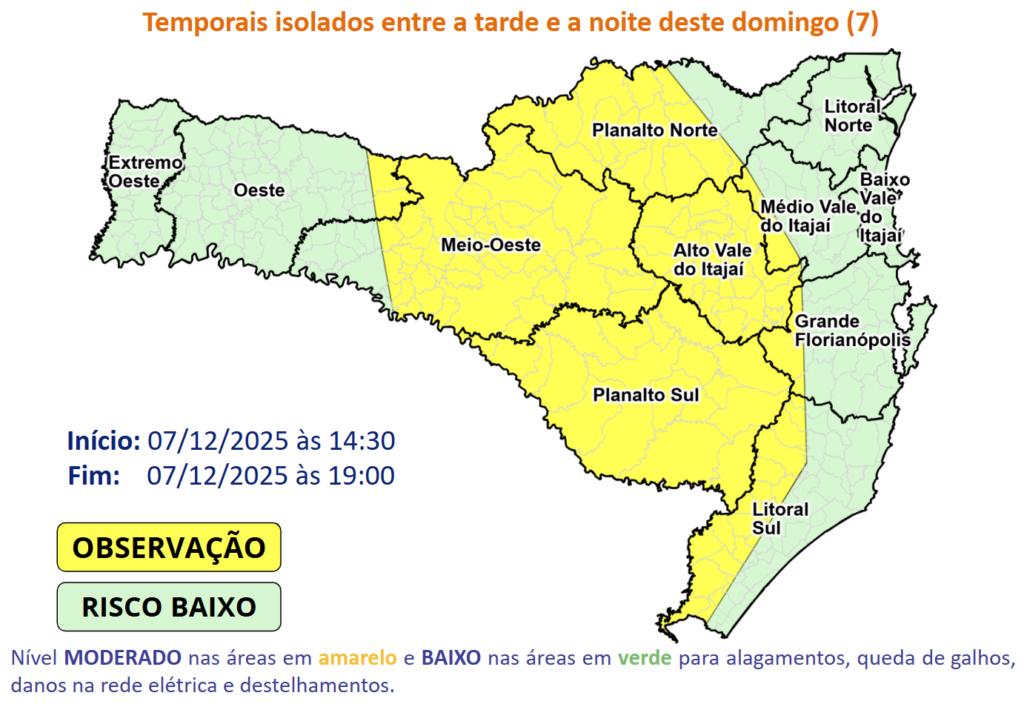 Neste domingo (07), o sol predomina na maior parte do dia em Santa Catarina. Entre a tarde e o início da noite, o calor, a umidade e a circulação favorecem a formação de pancadas de chuva e temporais isolados. O risco é moderado para ocorrências associadas a chuva intensa em curto período, rajadas de vento, eventual queda de granizo e alagamentosno Meio-Oeste, Planalto Sul, Planalto Norte, Alto Vale do Itajaí e parte do Litoral Sul . Nas demais regiões, o risco é baixo, com chuva mais isolada, intercalada por períodos de melhoria com sol e calor.