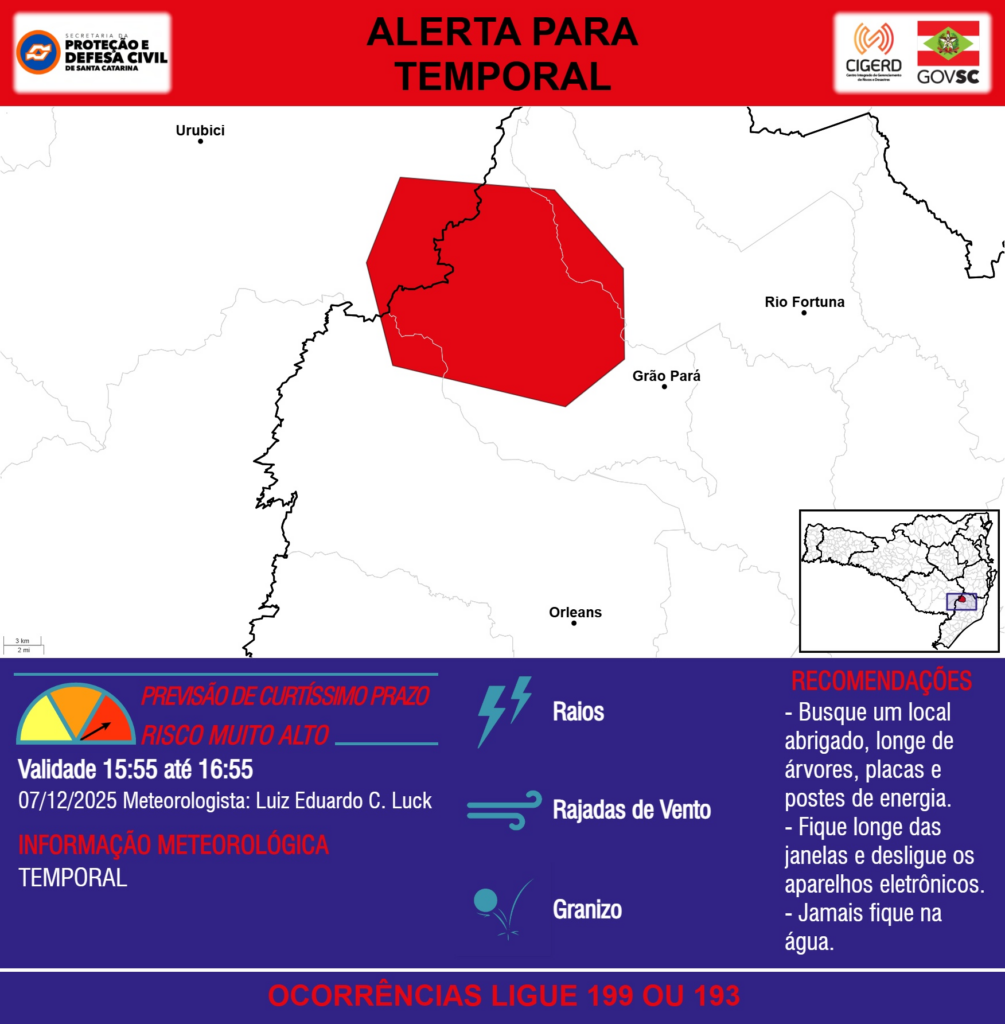 ALERTA – 07/12 15:55 – TEMPORAL com RAIOS, RAJADAS DE VENTO e GRANIZO para os municípios de Grão Pará, Orleans, Rio Fortuna e Urubici na próxima hora. Ocorrências ligue 199 ou 193.
