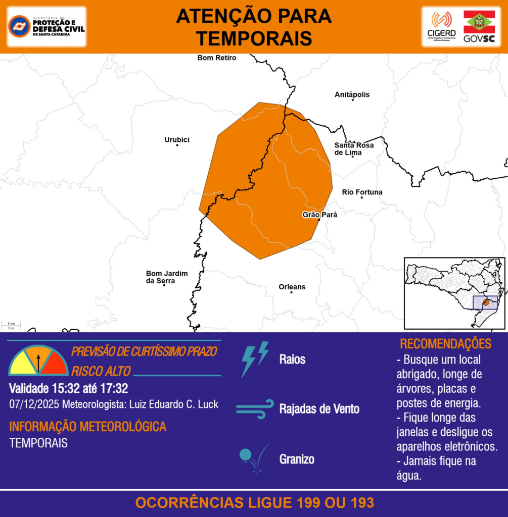 ATENÇÃO – 07/12 15:32 – TEMPORAIS com RAIOS, RAJADAS DE VENTO e GRANIZO para as regiões do Planalto Sul, Litoral Sul e Grande Florianópolis nas próximas 2 horas. Ocorrências ligue 199 ou 193.