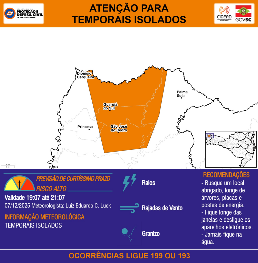 ATENÇÃO – 07/12 19:07 – TEMPORAIS ISOLADOS com RAIOS, RAJADAS DE VENTO e GRANIZO para os municípios de Dionísio Cerqueira, Guarujá do Sul, Palma Sola, Princesa e São José do Cedro nas próximas 2 horas. Ocorrências ligue 199 ou 193.
