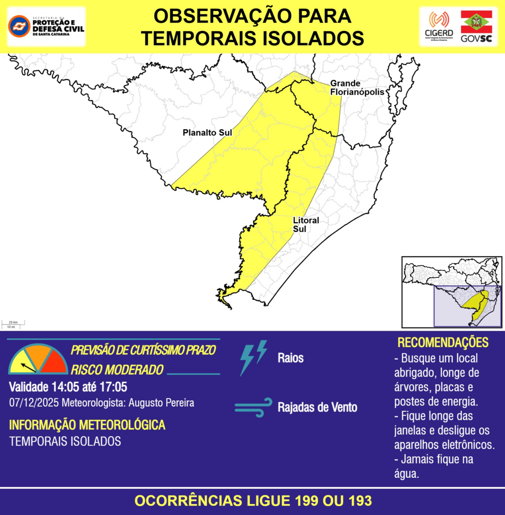 OBSERVAÇÃO – 07/12 14:05 – TEMPORAIS ISOLADOS com RAIOS e RAJADAS DE VENTO para os municípios de Alfredo Wagner, Angelina, Anitápolis, Bocaina do Sul, Bom Jardim da Serra, Braço do Norte, Cocal do Sul, Criciúma, Ermo, Forquilhinha, Grão Pará, Jacinto Machado, Lages, Lauro Müller, Leoberto Leal, Meleiro, Morro Grande, Nova Veneza, Orleans, Painel, Praia Grande, Rancho Queimado, Rio Fortuna, Rio Rufino, Santa Rosa de Lima, Siderópolis, São Joaquim, São Ludgero, Timbé do Sul, Treviso, Turvo, Urubici, Urupema e Urussanga nas próximas 3 horas. Ocorrências ligue 199 ou 193.