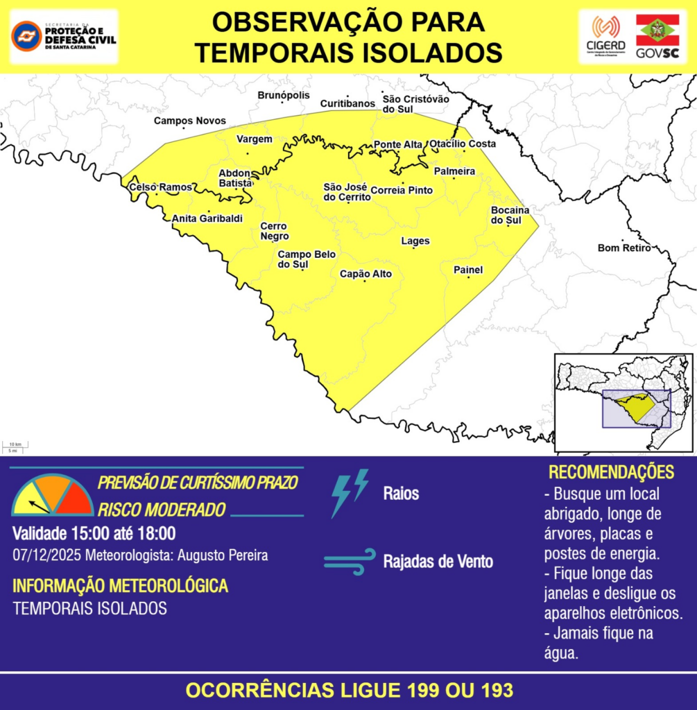 OBSERVAÇÃO – 07/12 15:00 – TEMPORAIS ISOLADOS com RAIOS e RAJADAS DE VENTO para os municípios de Abdon Batista, Anita Garibaldi, Bocaina do Sul, Bom Retiro, Brunópolis, Campo Belo do Sul, Campos Novos, Capão Alto, Celso Ramos, Cerro Negro, Correia Pinto, Curitibanos, Lages, Otacílio Costa, Painel, Palmeira, Ponte Alta, São Cristóvão do Sul, São José do Cerrito e Vargem nas próximas 3 horas. Ocorrências ligue 199 ou 193.