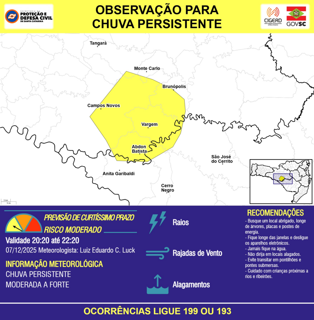 OBSERVAÇÃO – 07/12 20:20 – CHUVA PERSISTENTE de intensidade moderada a forte com RAIOS, RAJADAS DE VENTO e ALAGAMENTOS pontuais para as regiões do Meio-Oeste e Planalto Sul nas próximas 2 horas. Ocorrências ligue 199 ou 193.