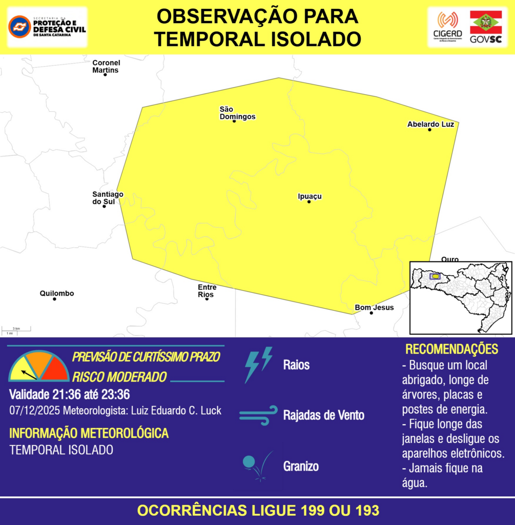 OBSERVAÇÃO – 07/12 21:36 – TEMPORAL ISOLADO com RAIOS, RAJADAS DE VENTO e GRANIZO para os municípios de Abelardo Luz, Bom Jesus, Coronel Martins, Entre Rios, Ipuaçu, Ouro Verde, Quilombo, Santiago do Sul e São Domingos nas próximas 2 horas. Ocorrências ligue 199 ou 193.
