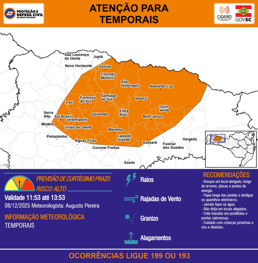 ATENÇÃO – 08/12 11:53 – TEMPORAIS com RAIOS, RAJADAS DE VENTO, GRANIZO e ALAGAMENTOS para os municípios de Abelardo Luz, Bom Jesus, Coronel Freitas, Coronel Martins, Entre Rios, Faxinal dos Guedes, Formosa do Sul, Galvão, Ipuaçu, Irati, Jardinópolis, Jupiá, Lajeado Grande, Marema, Modelo, Novo Horizonte, Ouro Verde, Pinhalzinho, Quilombo, Santiago do Sul, Serra Alta, Sul Brasil, São Domingos, São Lourenço do Oeste, União do Oeste, Vargeão, Xanxerê, Xaxim e Águas Frias nas próximas 2 horas. Ocorrências ligue 199 ou 193.