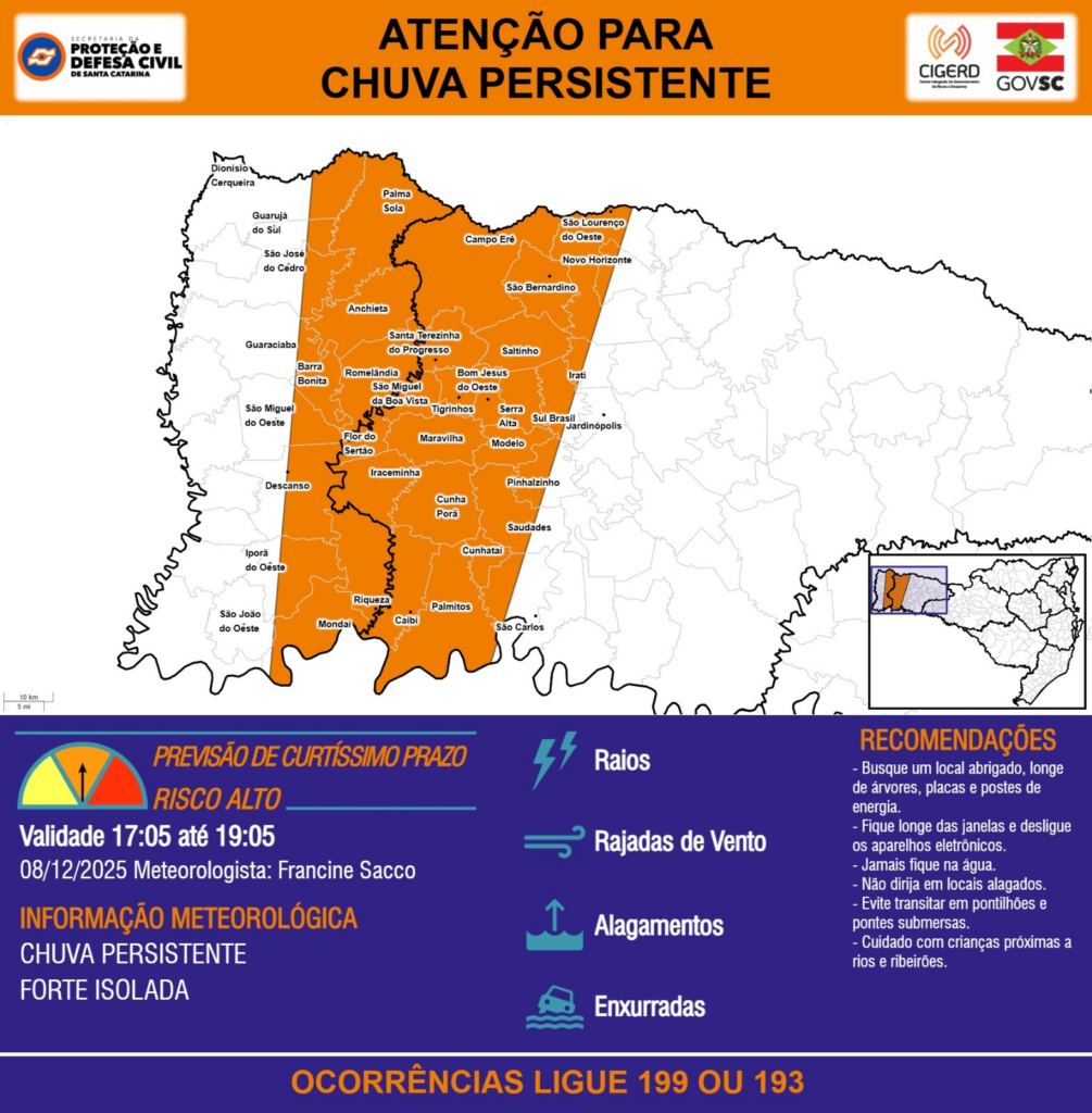 ATENÇÃO – 08/12 17:05 – CHUVA PERSISTENTE de intensidade forte isolada com RAIOS, RAJADAS DE VENTO, ALAGAMENTOS e risco de ENXURRADAS para as regiões do Extremo Oeste e Oeste nas próximas 2 horas. Ocorrências ligue 199 ou 193.