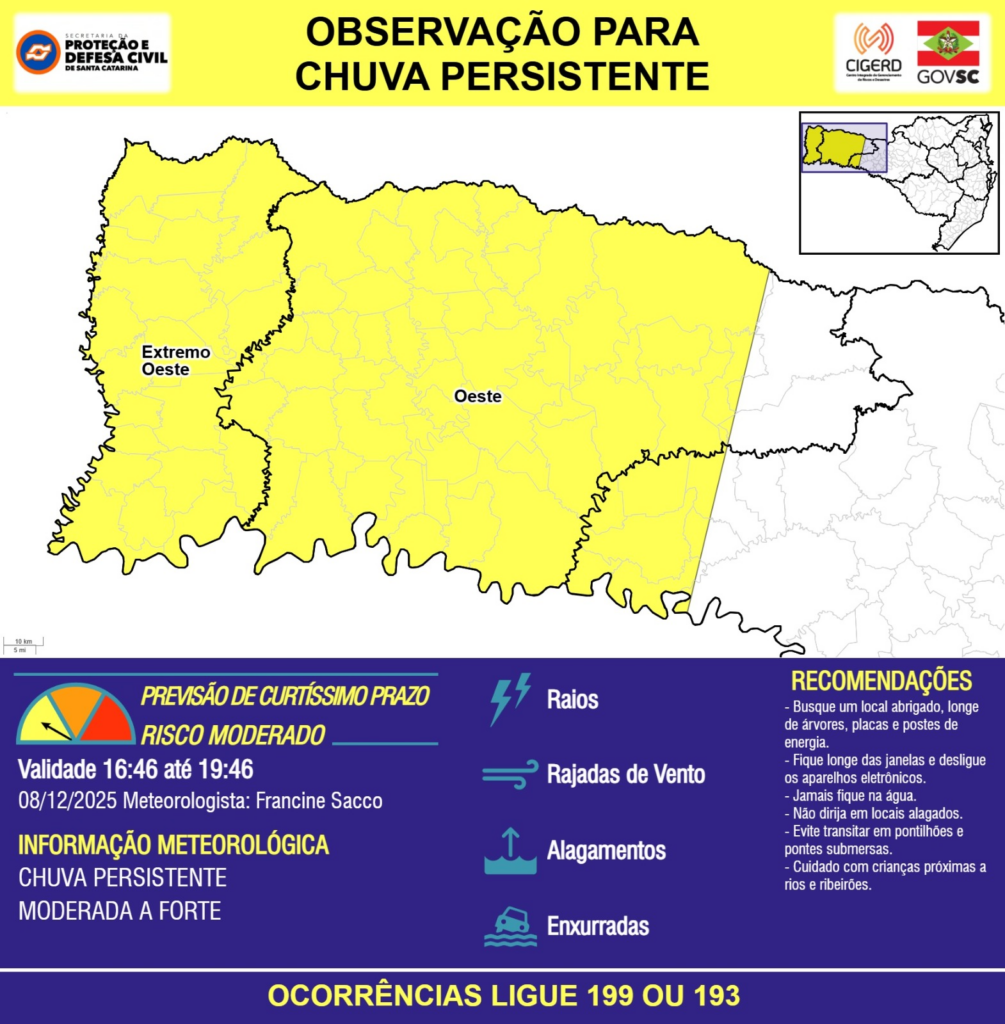 OBSERVAÇÃO – 08/12 16:46 – CHUVA PERSISTENTE de intensidade moderada a forte com RAIOS, RAJADAS DE VENTO, ALAGAMENTOS pontuais e risco de ENXURRADAS para as regiões do Extremo Oeste, Oeste e Meio-Oeste nas próximas 3 horas. Ocorrências ligue 199 ou 193.
