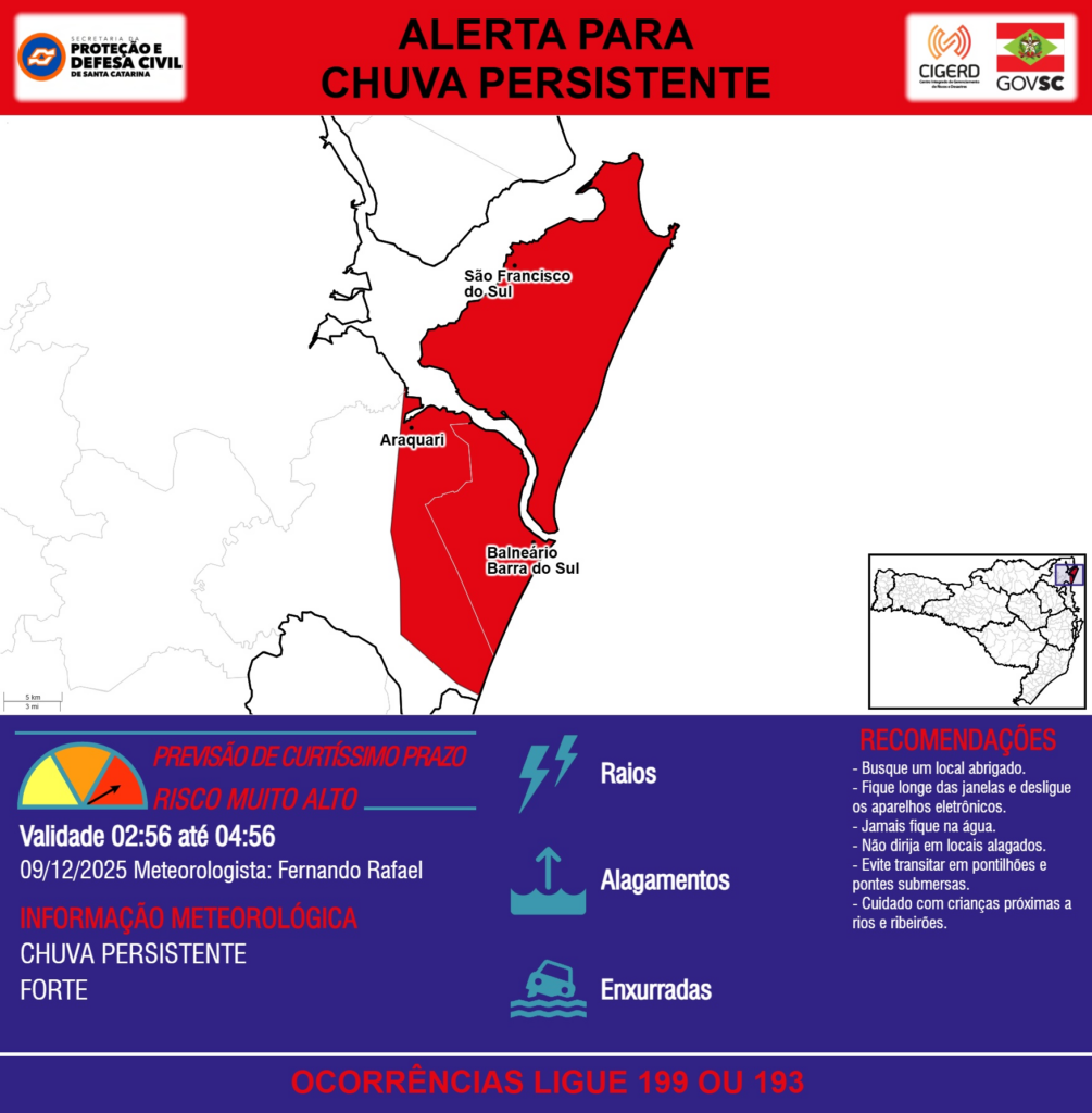 ALERTA – 09/12 02:56 – CHUVA PERSISTENTE de intensidade forte com RAIOS, ALAGAMENTOS e risco de ENXURRADAS para os municípios de Araquari, Balneário Barra do Sul e São Francisco do Sul nas próximas 2 horas. Ocorrências ligue 199 ou 193.